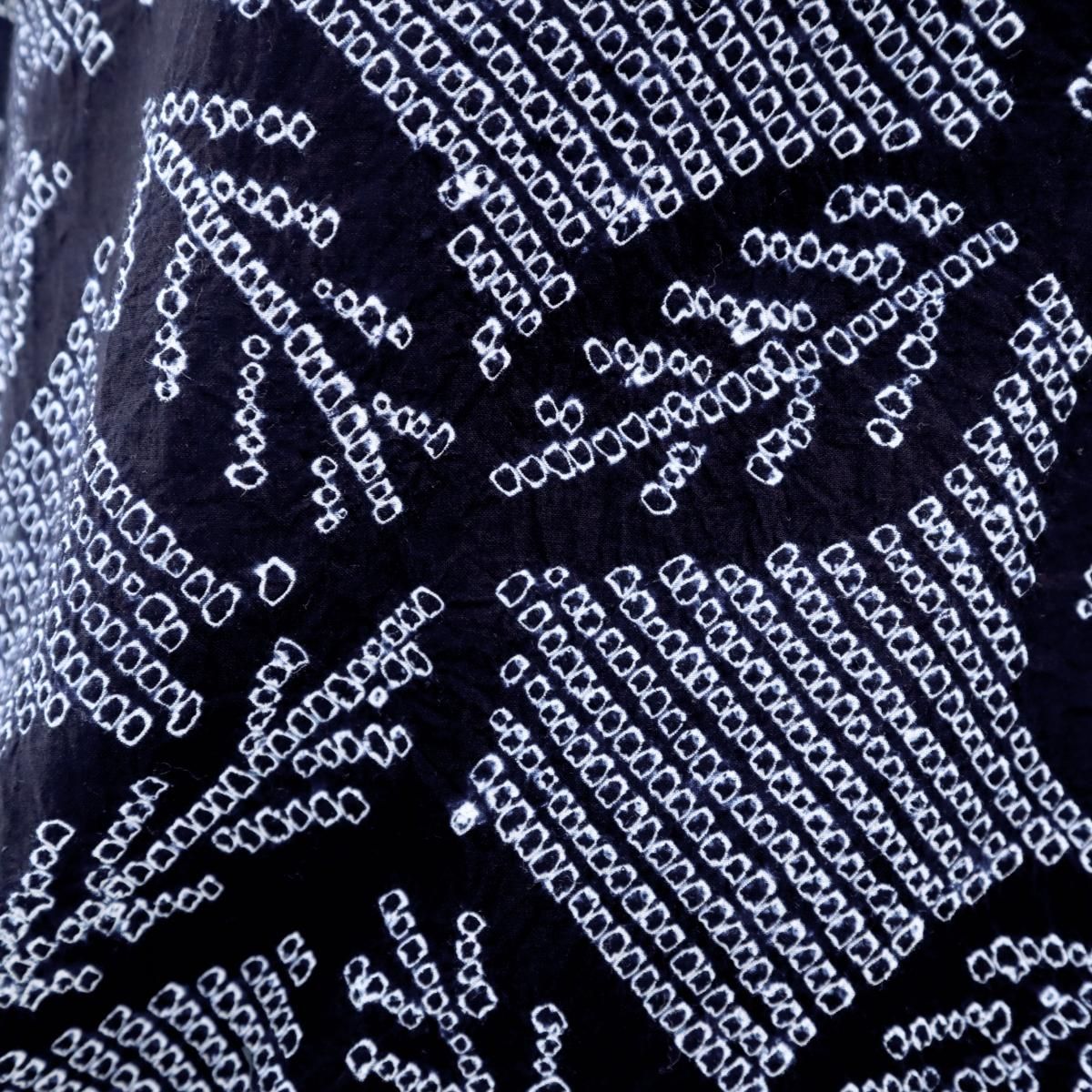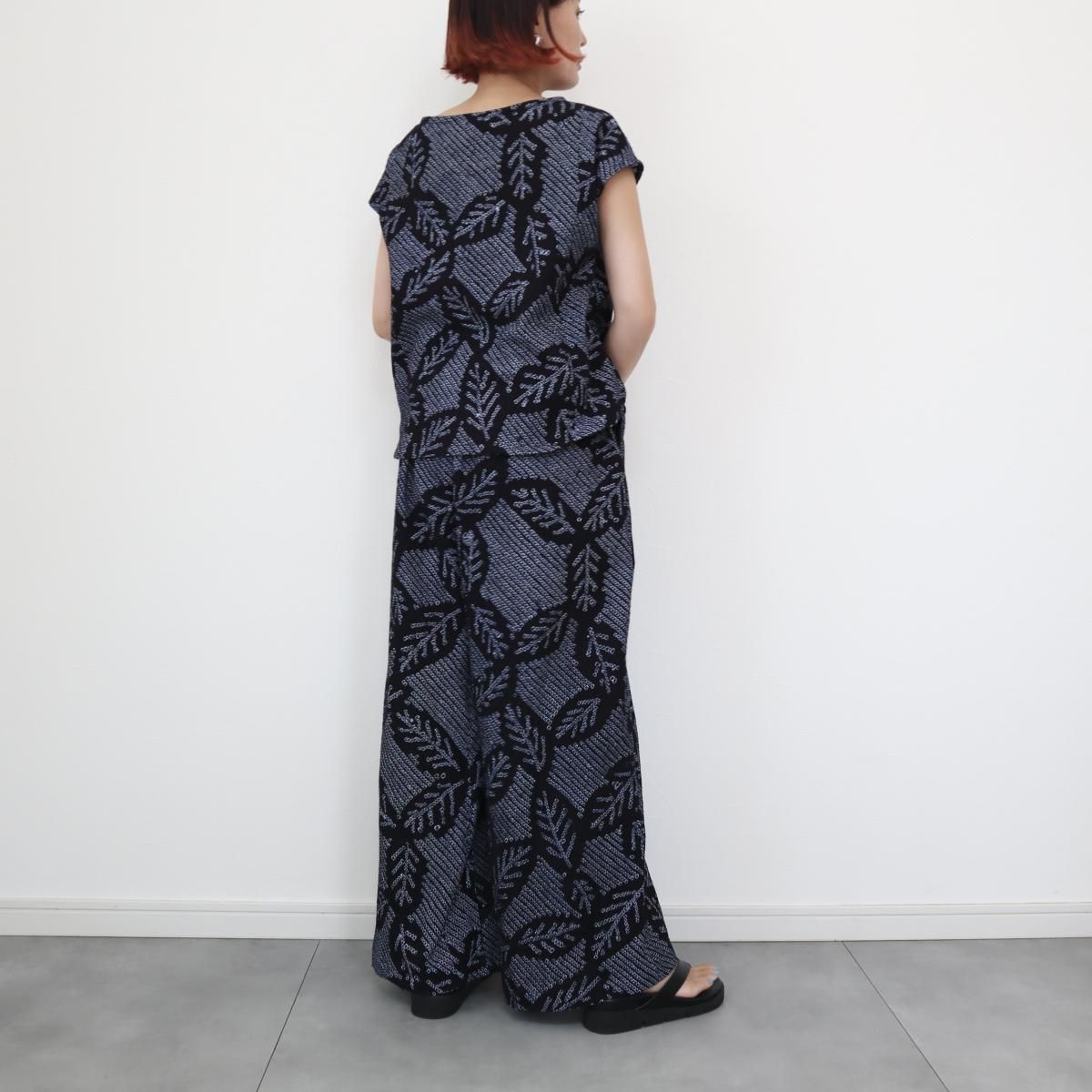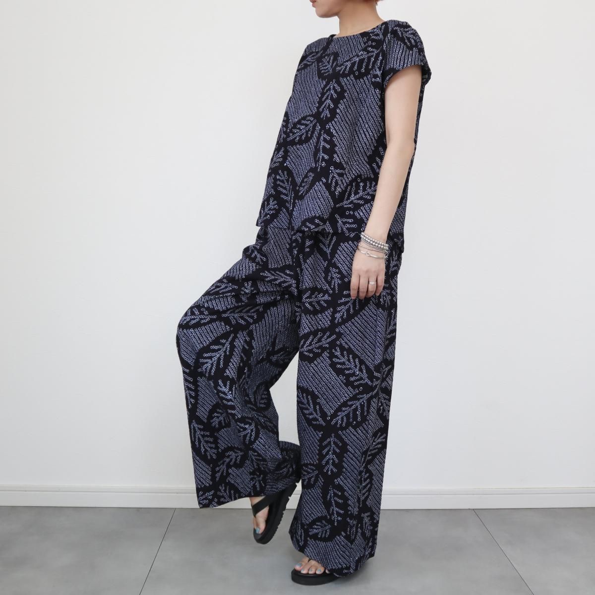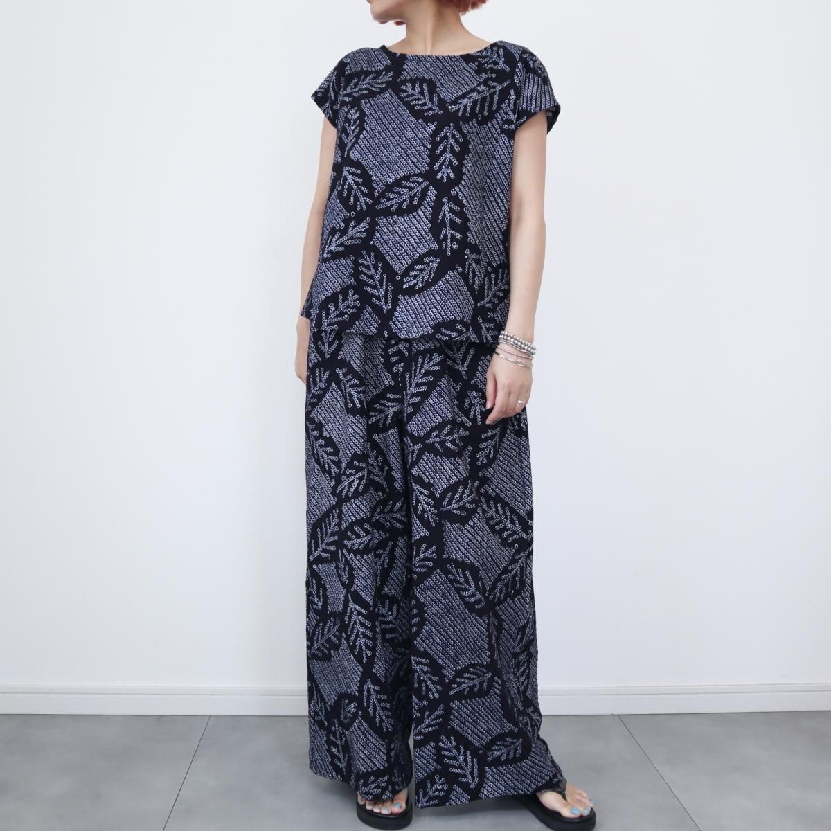 古い絞り染め浴衣から作ったTシャツブラウスとワイドパンツのセットアップです。濃い藍色×白の葉っぱ柄。ブラウスはTシャツ感覚で着て頂けるすっきりとしたシルエットです。パンツは太めで前にのみポケットがついています。もちろんセットアップだけではなく単品でも着られます。裏地はありません。