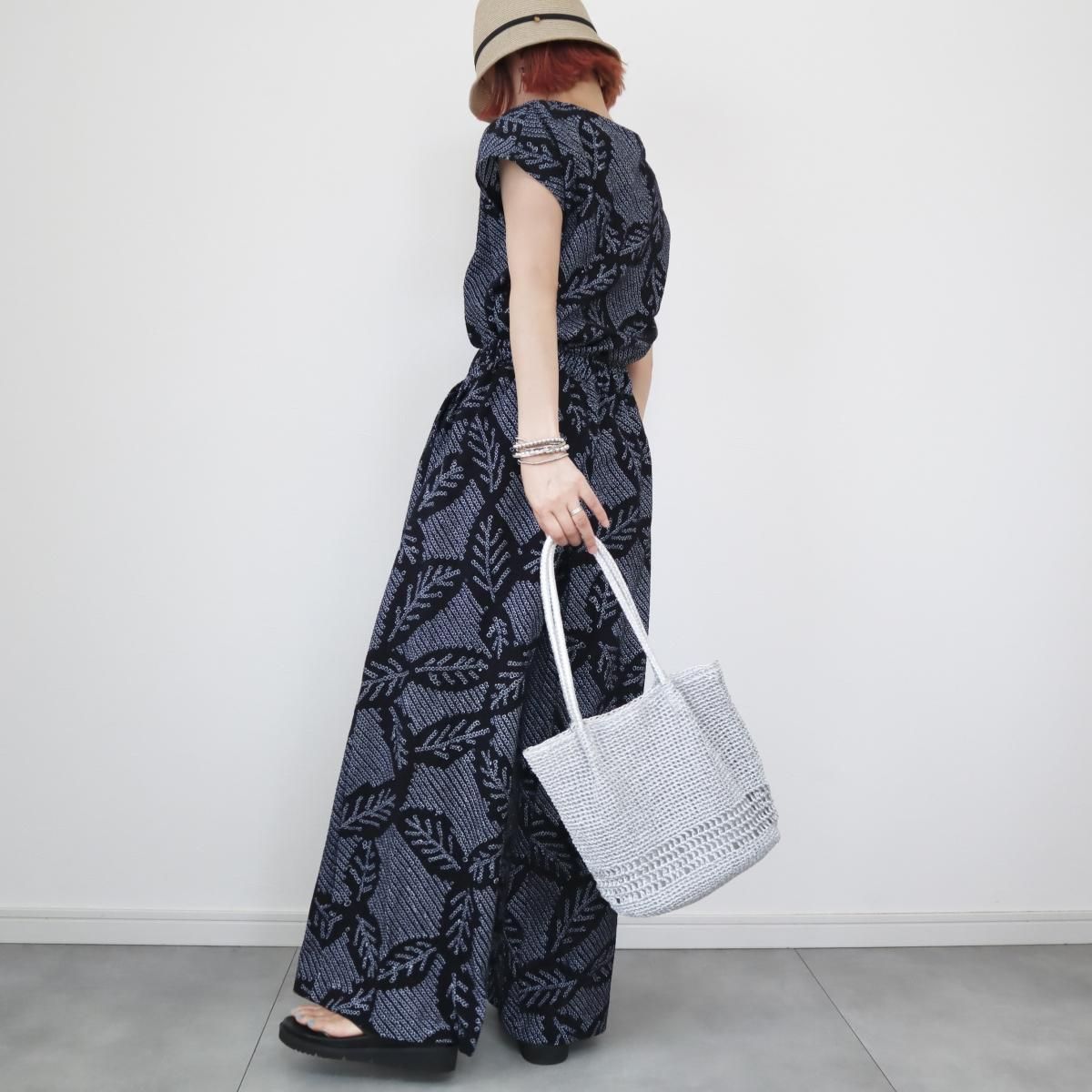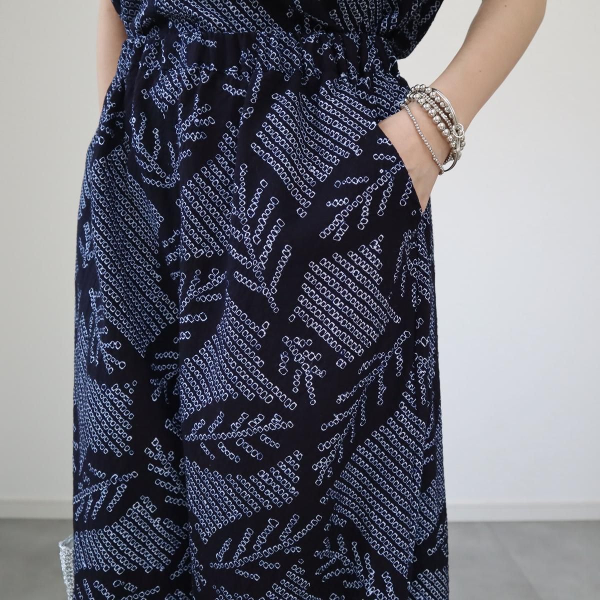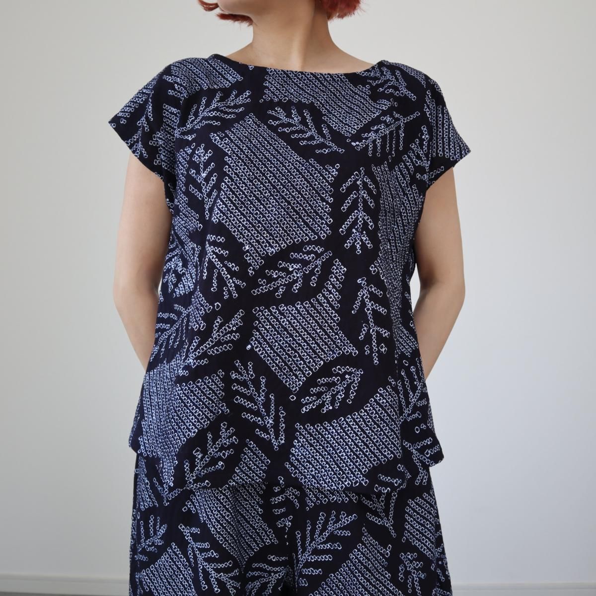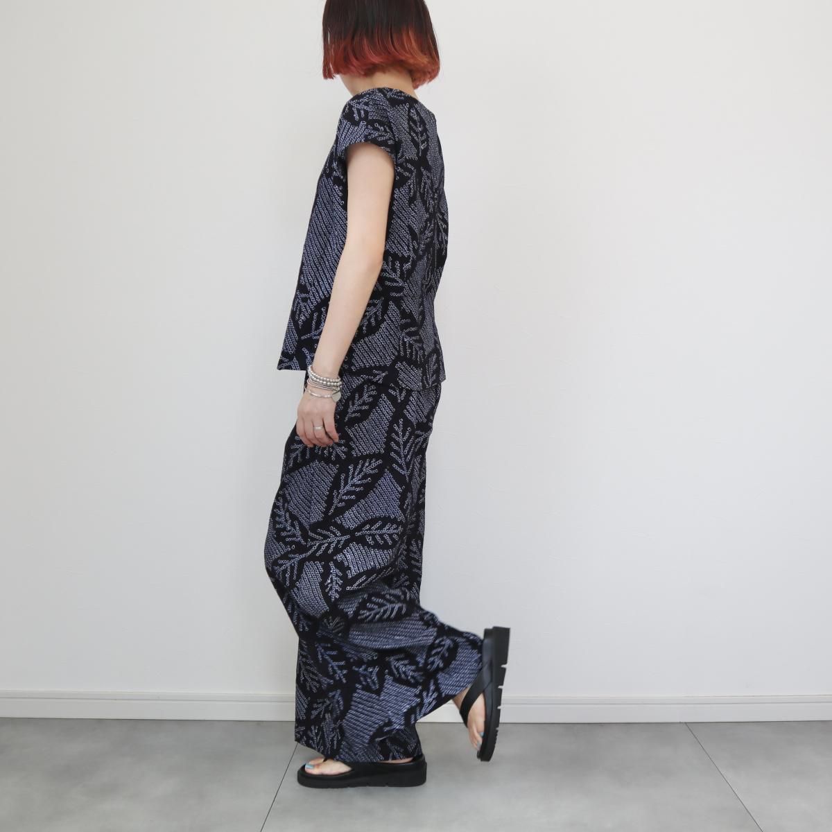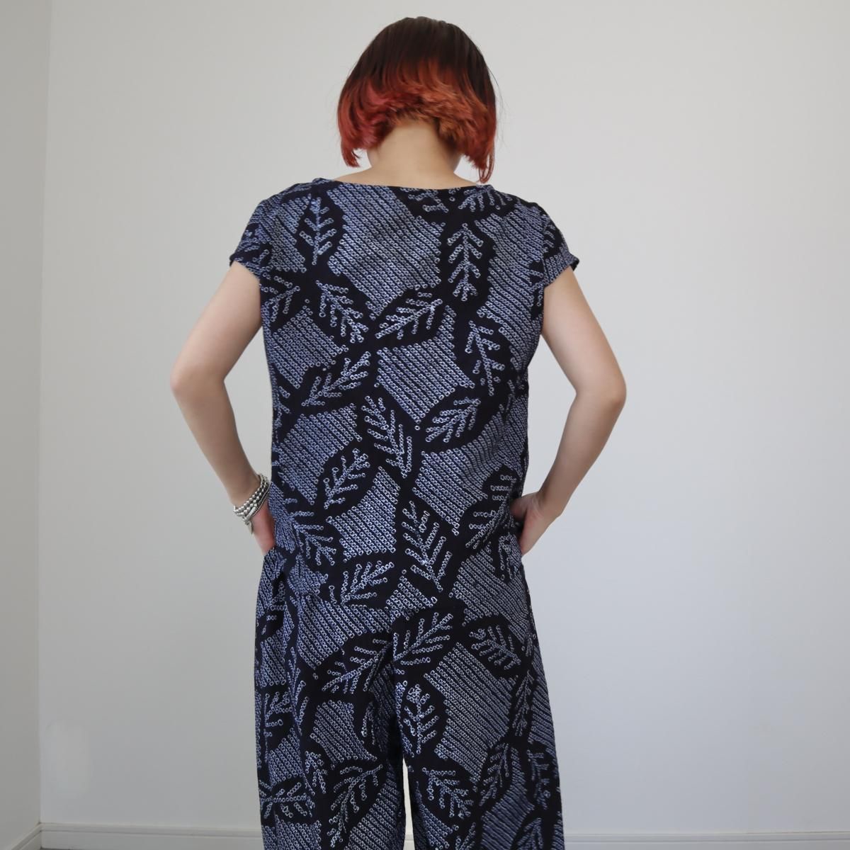 古い絞り染め浴衣から作ったTシャツブラウスとワイドパンツのセットアップです。濃い藍色×白の葉っぱ柄。ブラウスはTシャツ感覚で着て頂けるすっきりとしたシルエットです。パンツは太めで前にのみポケットがついています。もちろんセットアップだけではなく単品でも着られます。裏地はありません。