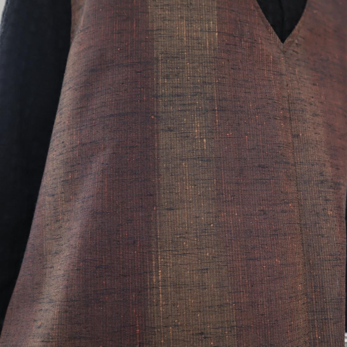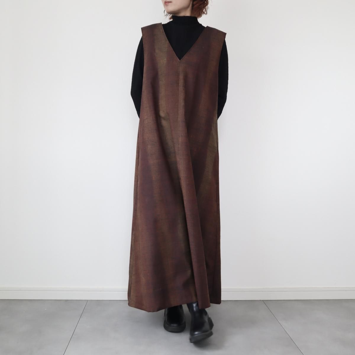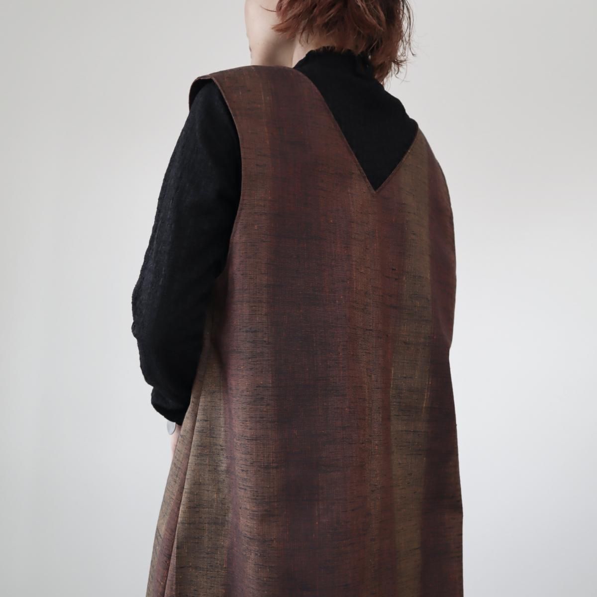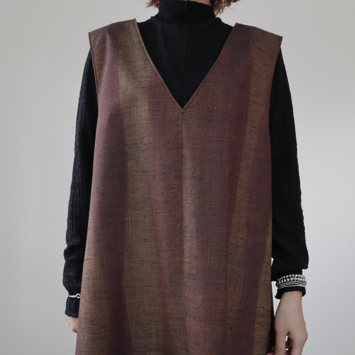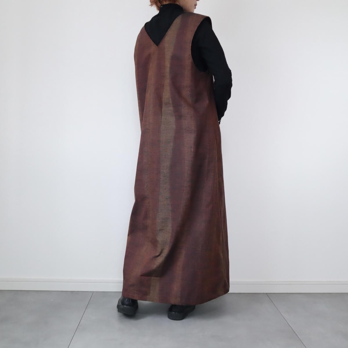 アンティーク着物から作ったジャンパースカートです。ブラウン系の立涌文様。しっかりとした紬の生地です。前後Vネックで体のラインがすっきりと見えます。肩から胸位置にのみ裏地つき。