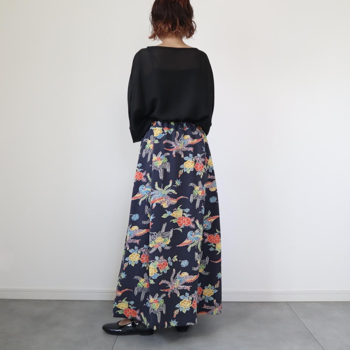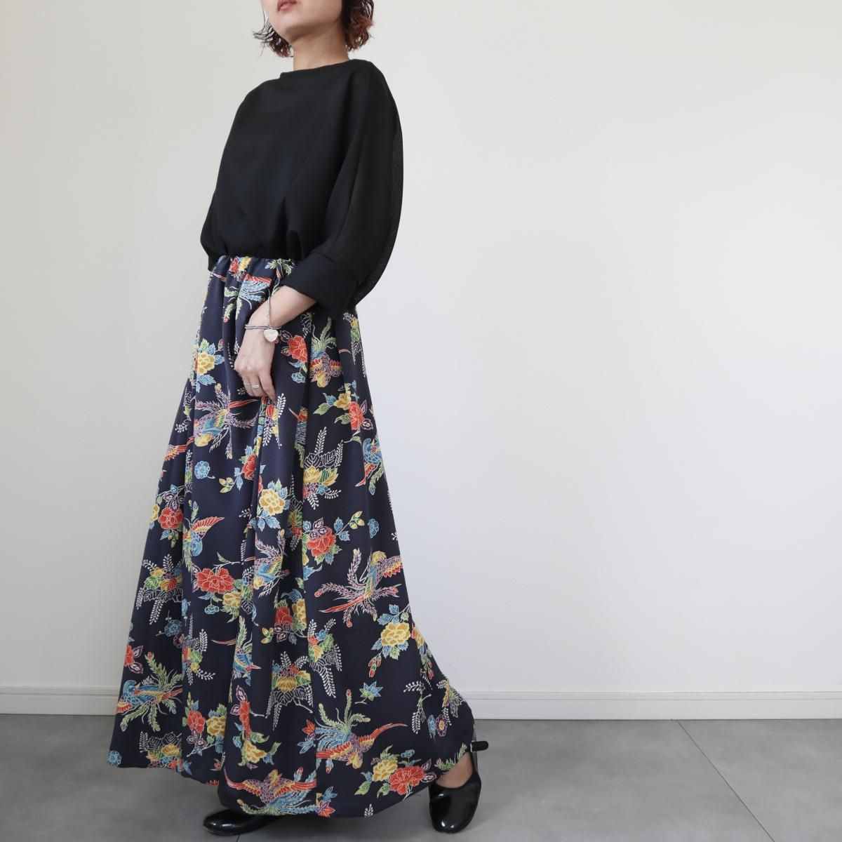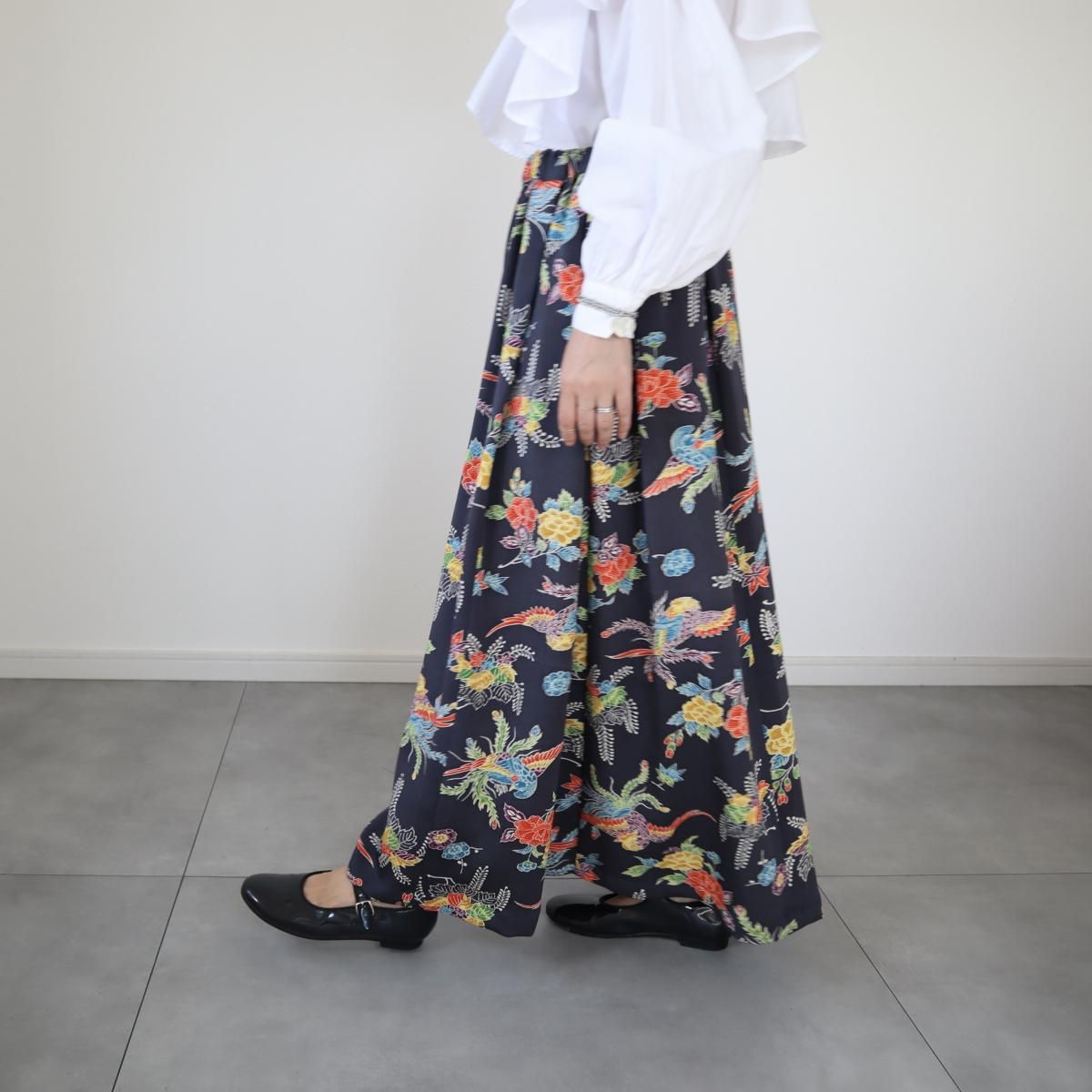 小紋の着物から作ったタック入りスカート・マキシ丈(紅型風・M)