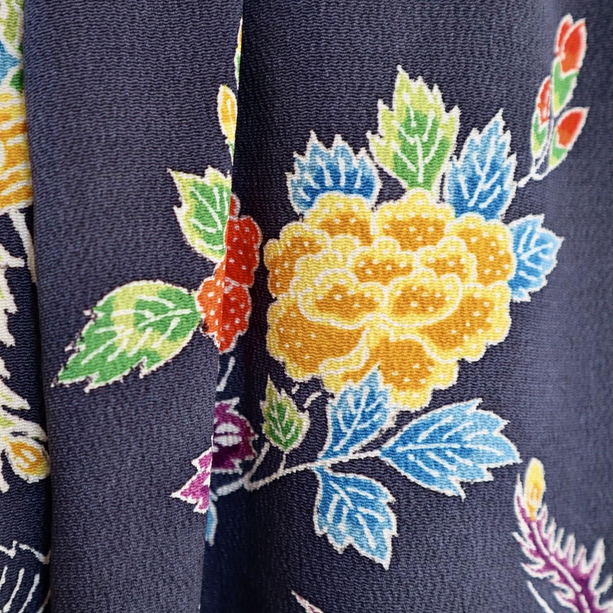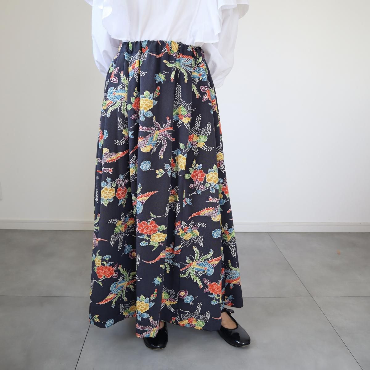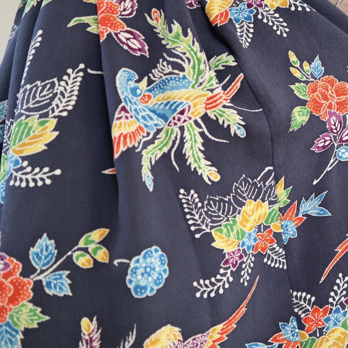 アンティークの小紋の着物から作ったギャザースカートです。深いブルーグレーのようなお色の地に紅型風の柄が染められています。薄手で柔らかですがしっかりとした縮緬素材。ウエストにはゴムを通しており、タックも入れているので腰回りはすっきりとしています。裏地はありません。内側タグを後ろ中央に合わせてご着用ください。