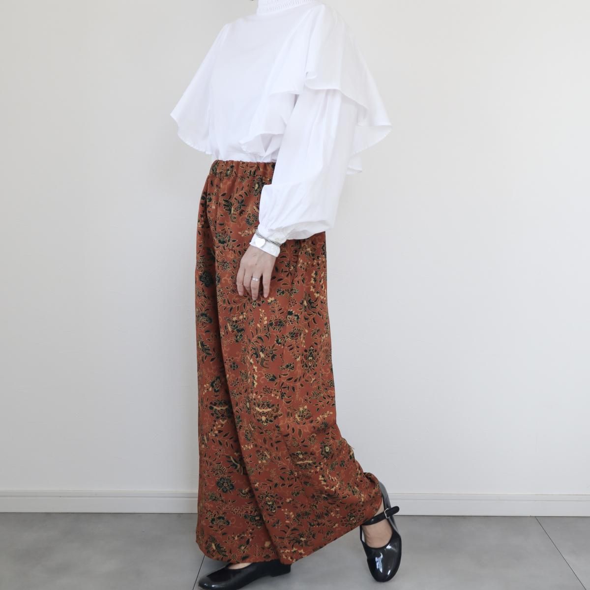 アンティークの小紋の着物から作ったワイドパンツです。薄手で柔らかですがしっかりとした縮緬素材。ベースのお色の再現が難しかったのですが薄いレンガ色のような明るい赤茶色のようなお色です。ウエストにはゴムを通しており、両サイドにポケットがついています。裏地はありません。