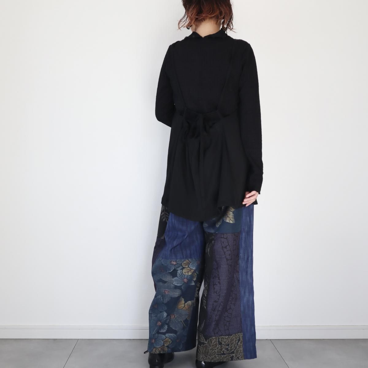 アンティーク紬をパッチワークして作ったワイドパンツです。黒~藍色系の生地でまとめました。ウエストにはゴムを通しており、両サイドにポケットがついています。裏地はありません。