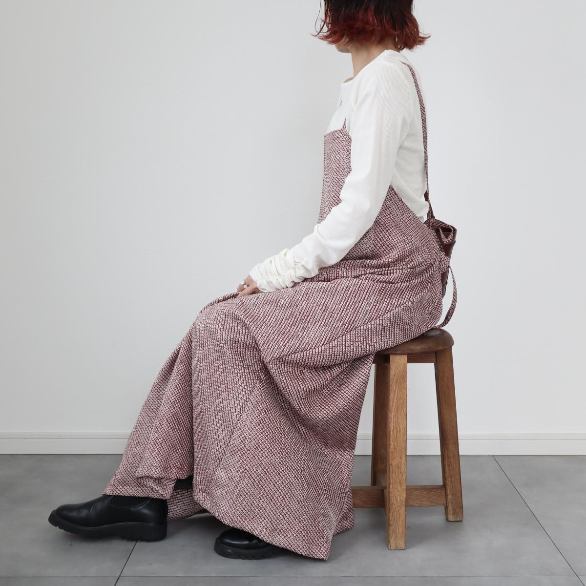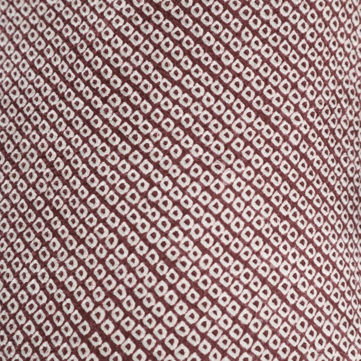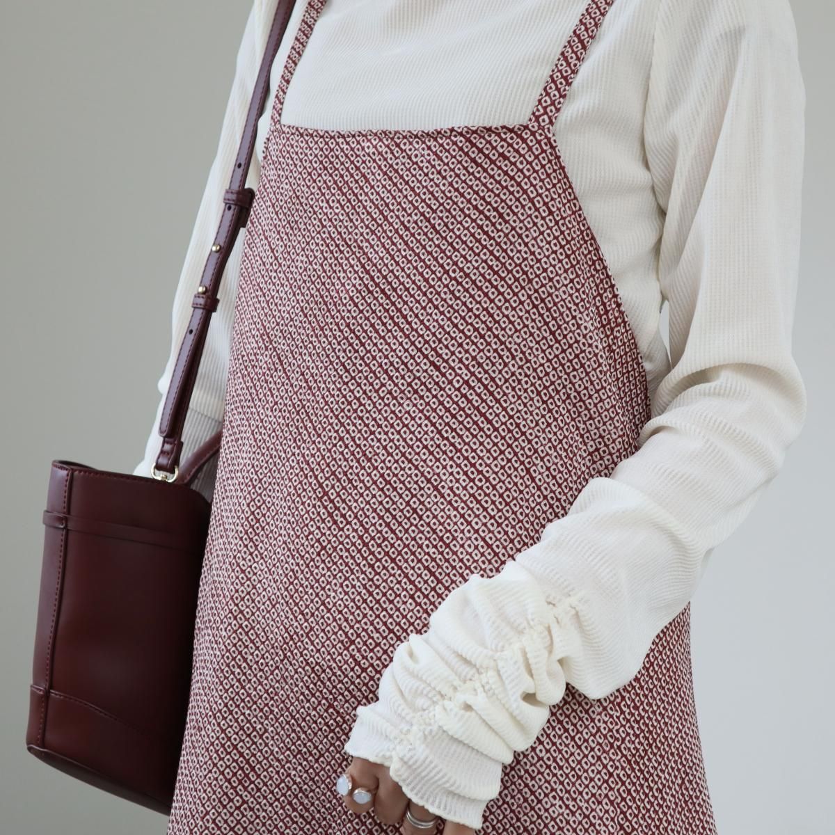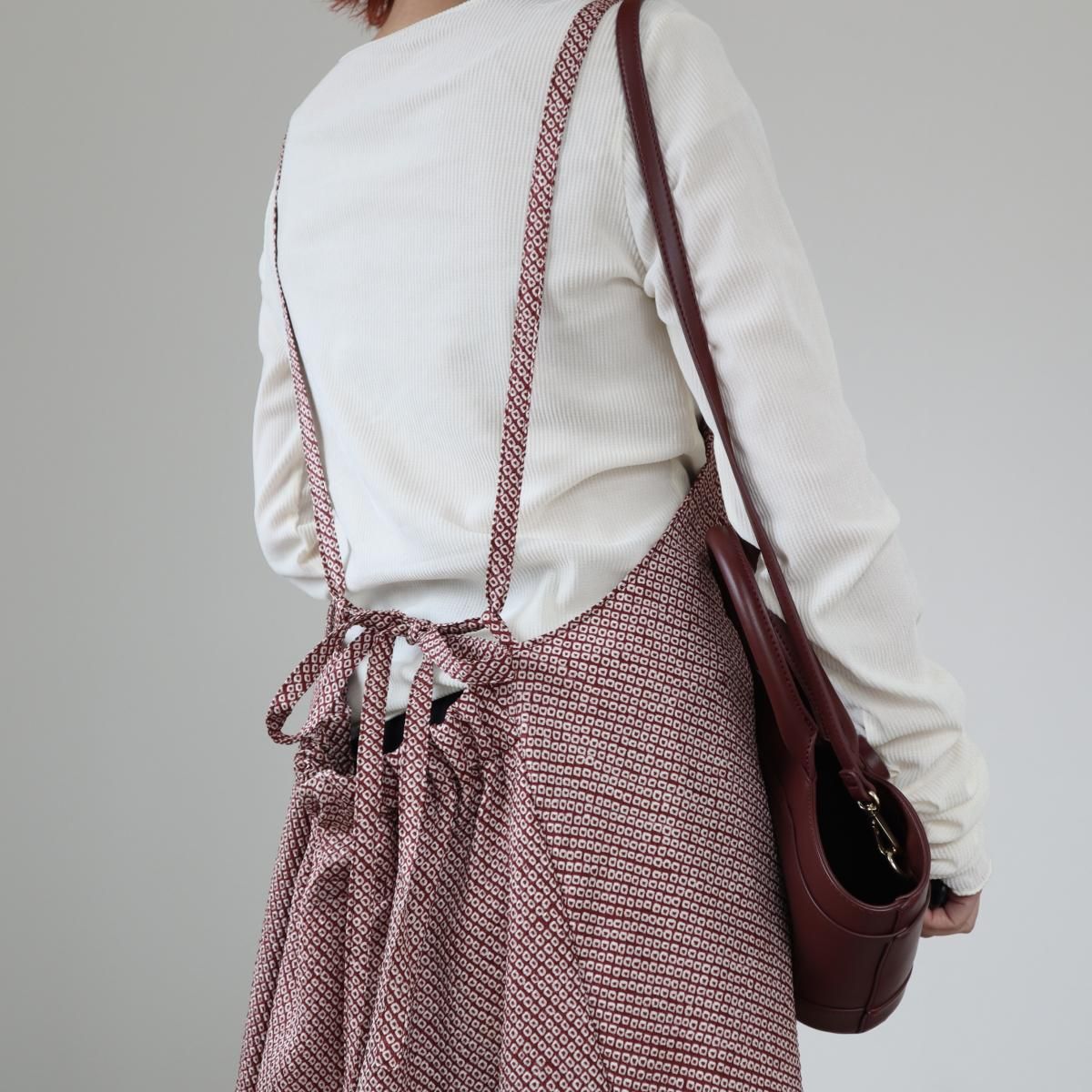アンティークの絞り染め着物から作ったキャミソールワンピースです。赤茶色×生成色の絞り染め。薄手で柔らかですがしっかりとした素材です。背中部分にはゴムを入れており、肩紐は長さ調整可能です。スカート部分には裏地がありませんのでパンツ等を重ねてご着用ください。