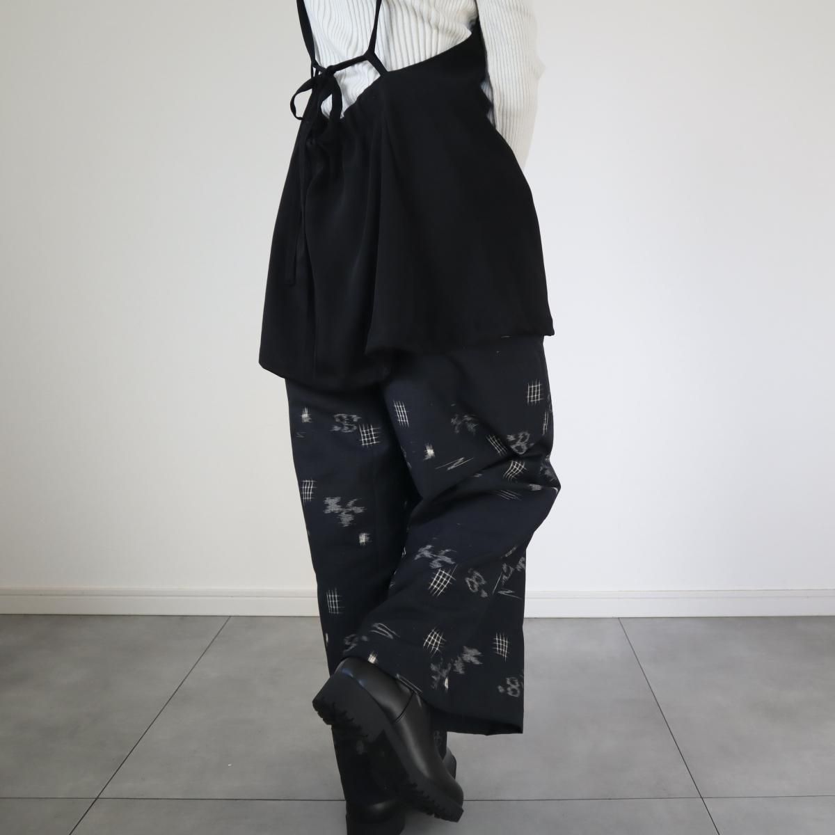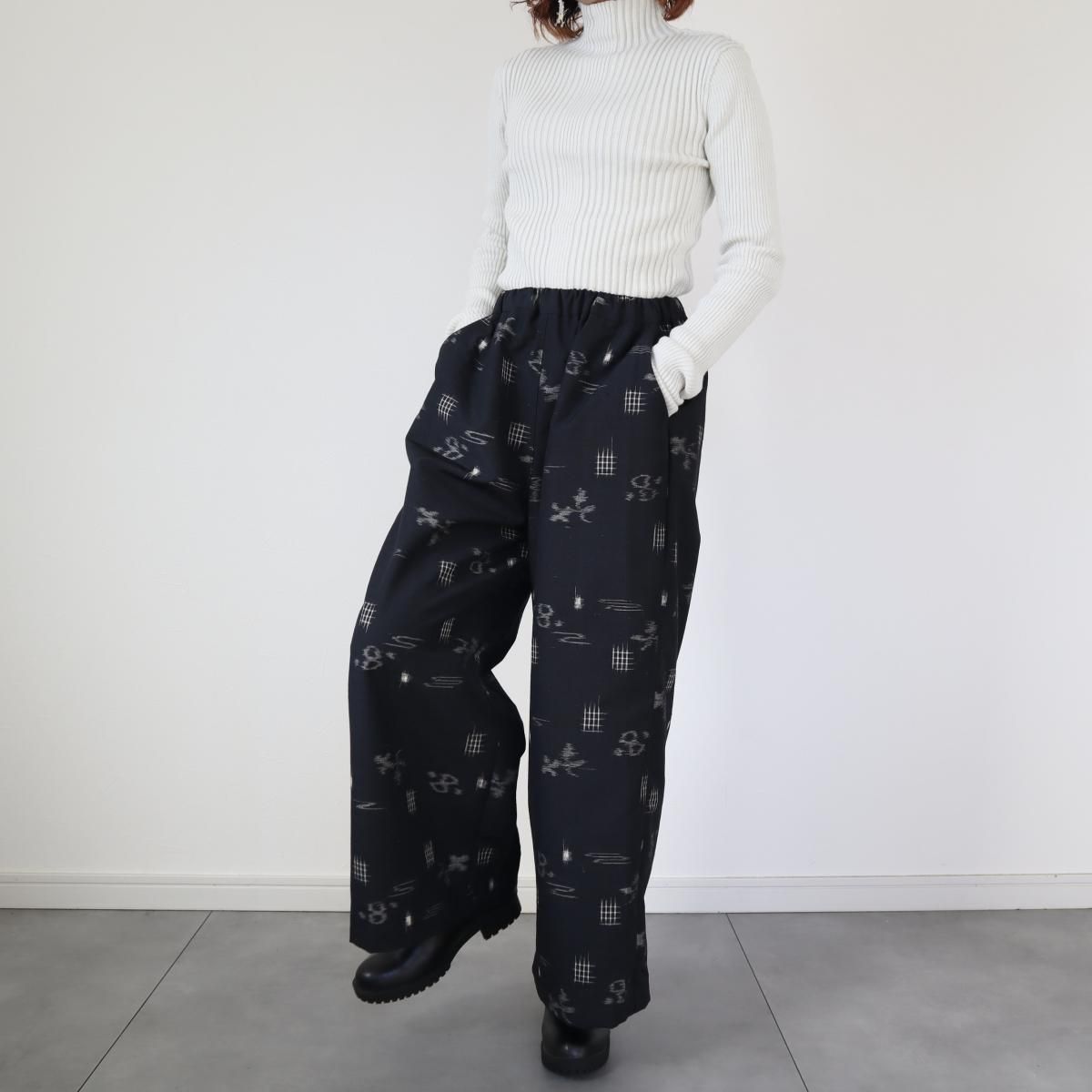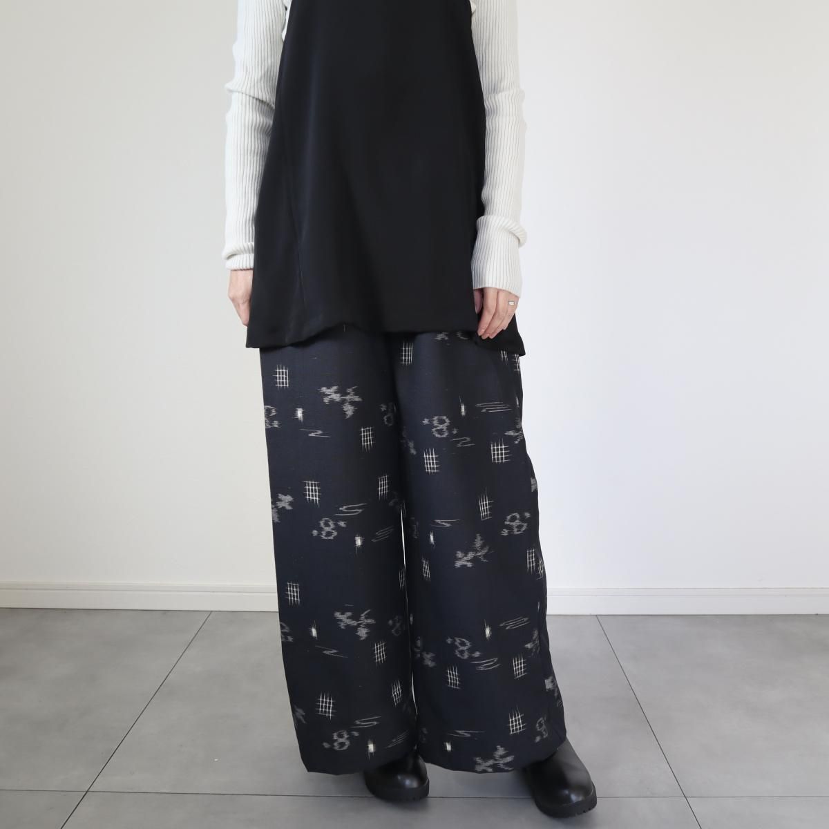アンティーク紬で作ったワイドパンツです。黒とグレーの琉球絣。ウエストにはゴムを通しており、両サイドにポケットがついています。裏地はありません。