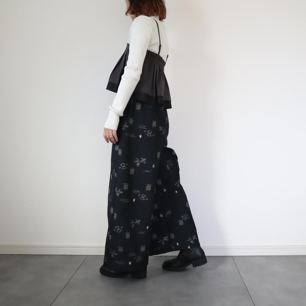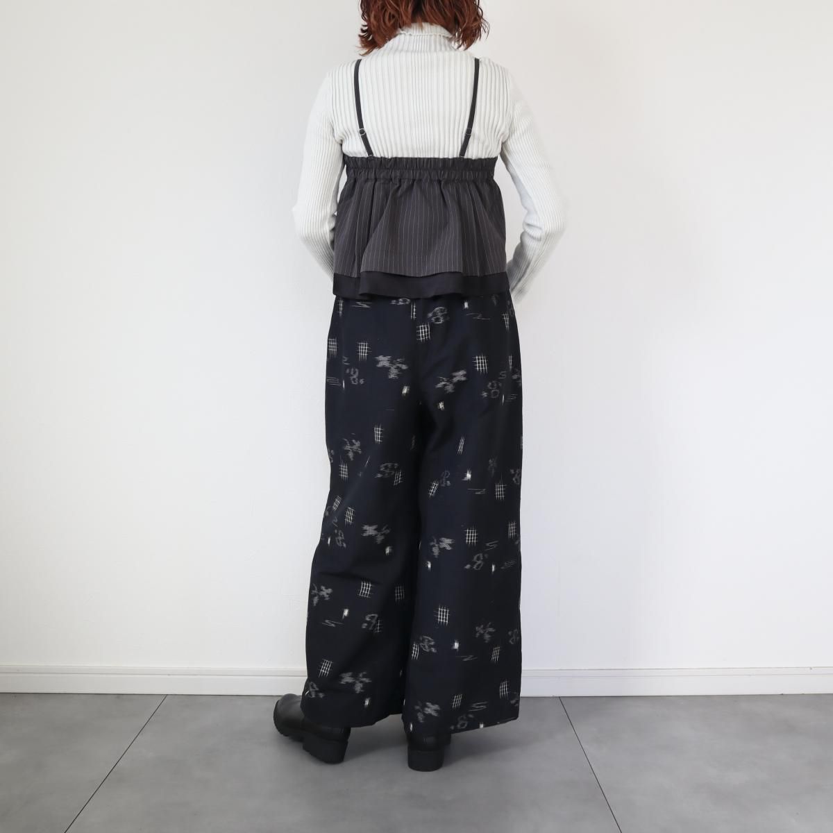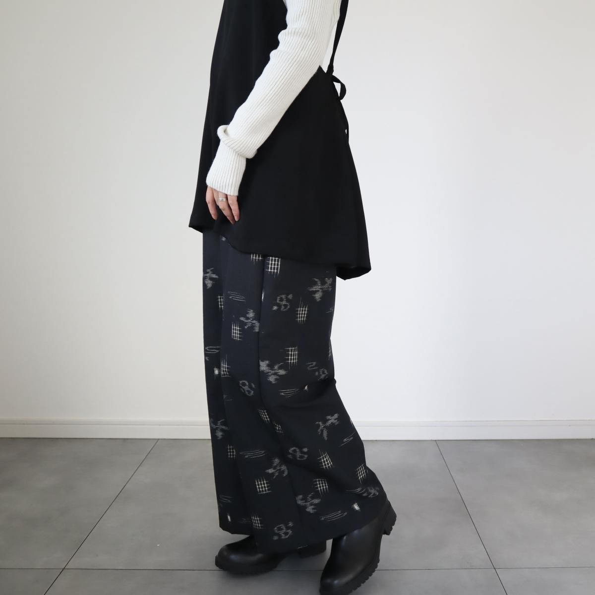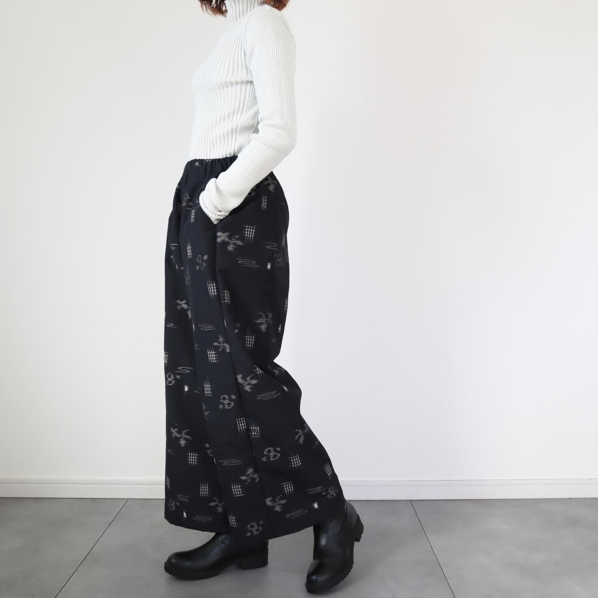 アンティーク紬で作ったワイドパンツです。黒とグレーの琉球絣。ウエストにはゴムを通しており、両サイドにポケットがついています。裏地はありません。