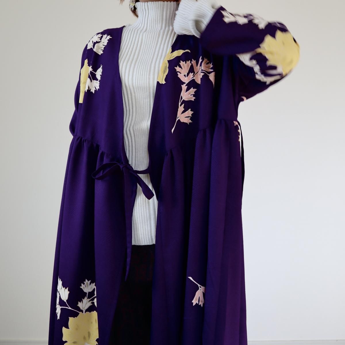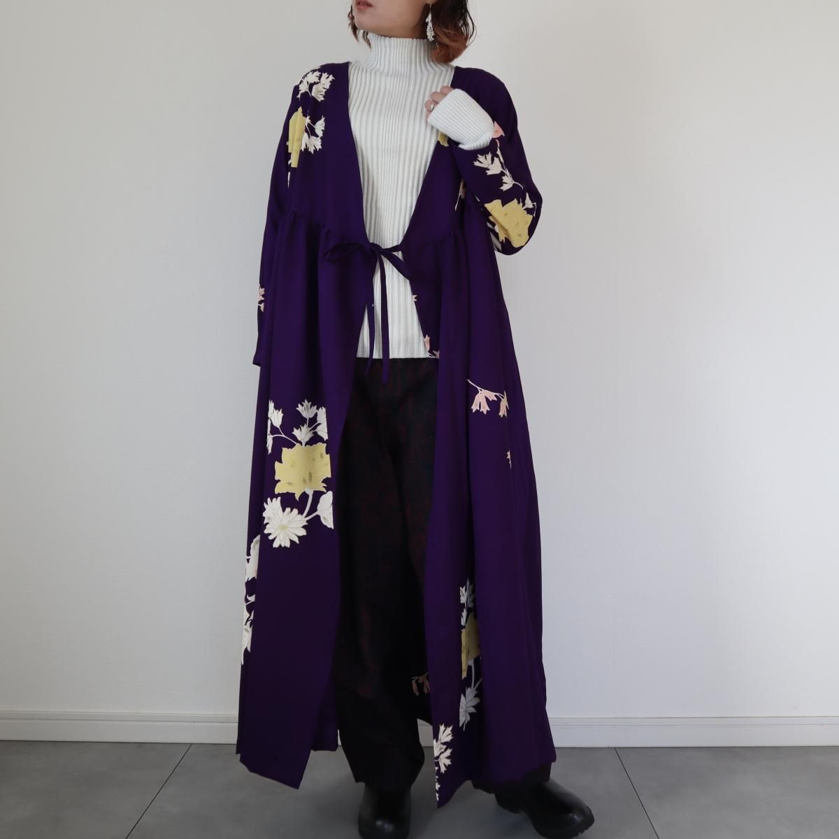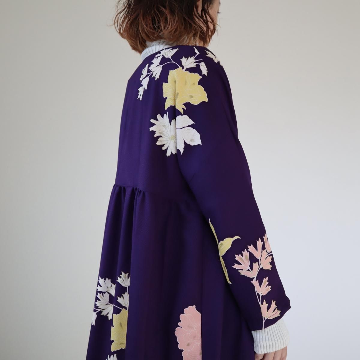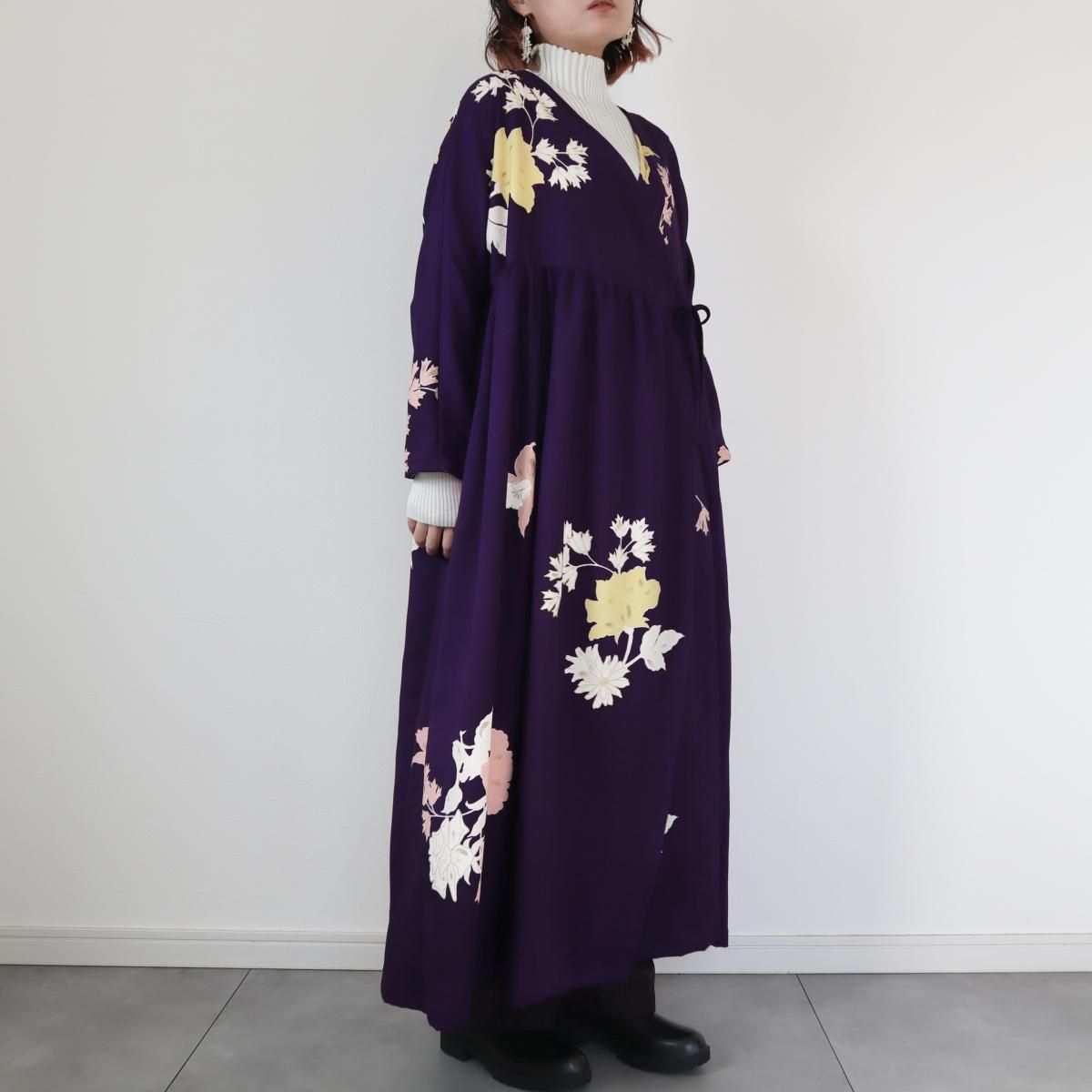 アンティークの付け下げ着物から作ったカシュクールワンピースです。濃い紫色の地に花の柄。薄手で柔らかですがしっかりとした素材です。ハイウエスト位置で生地を切り替えギャザーを寄せています。前を開けて羽織ったり外側のリボン同士を結んだりしてもご着用頂けます。裏地はありません。