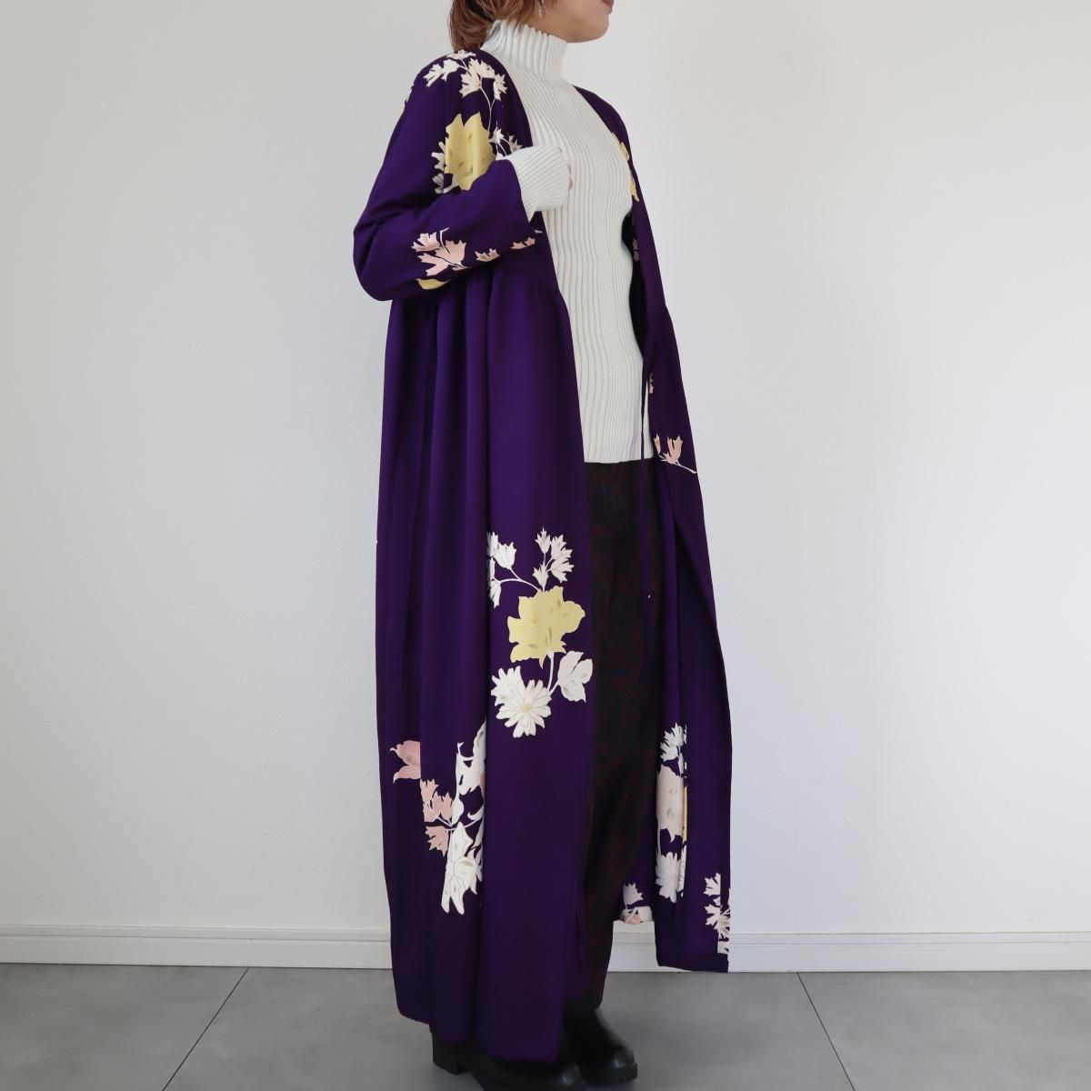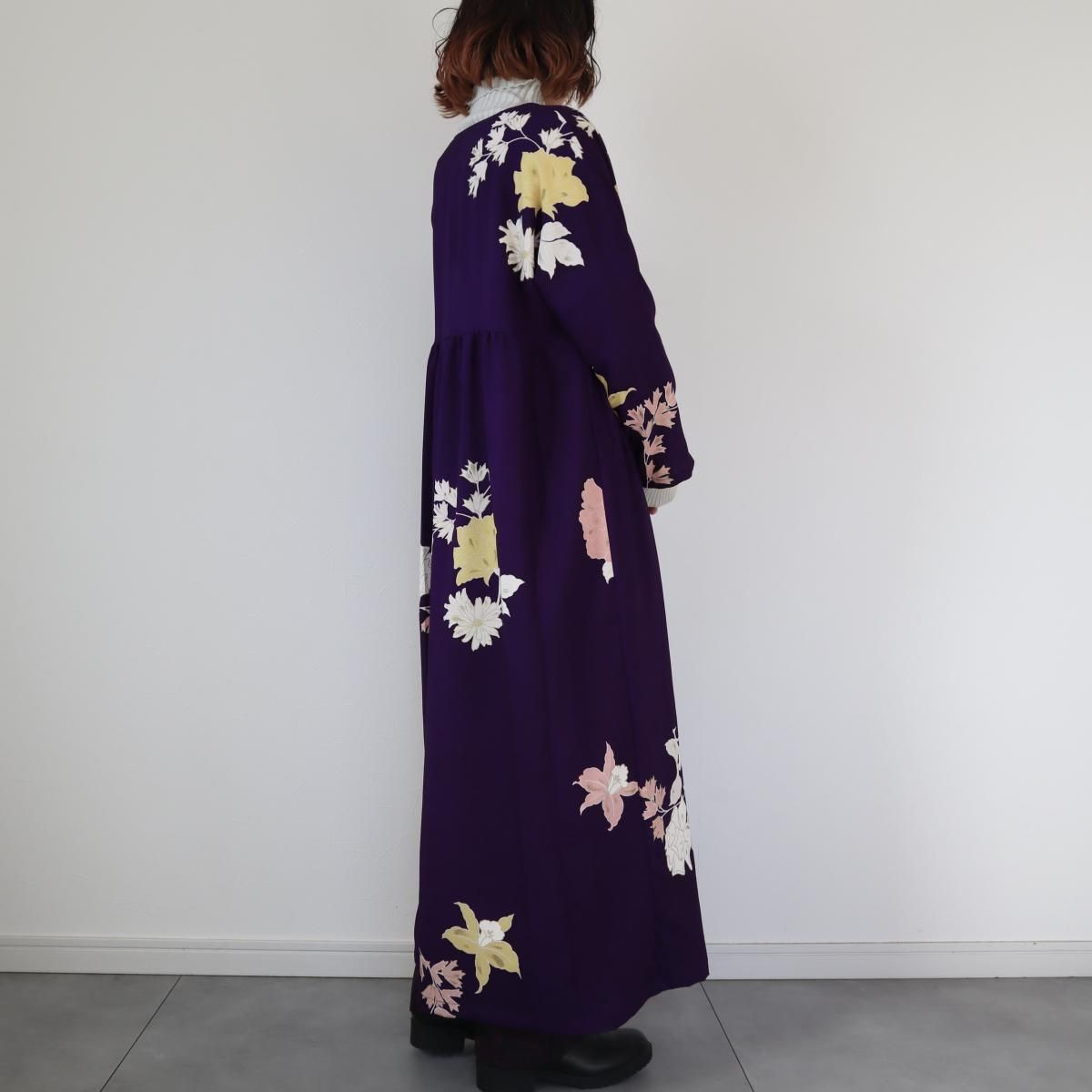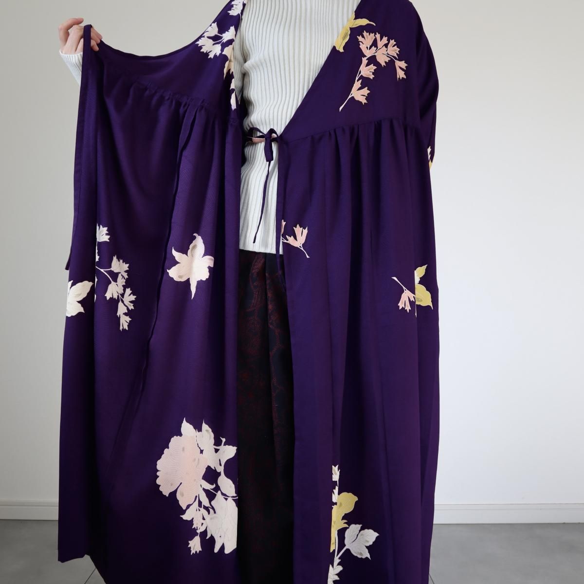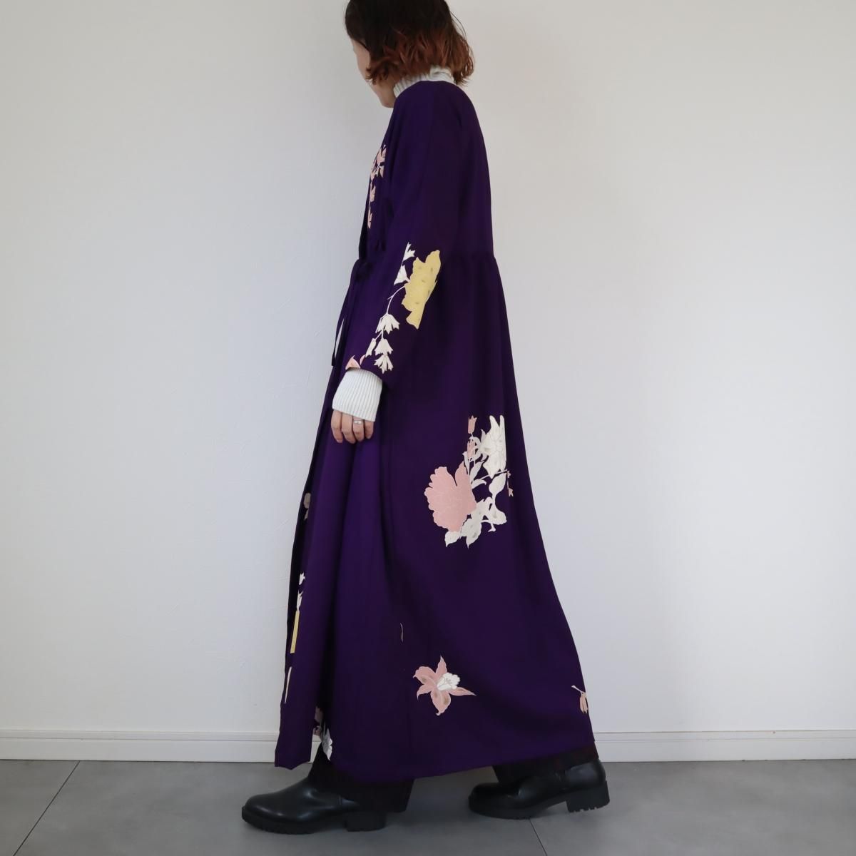 アンティークの付け下げ着物から作ったカシュクールワンピースです。濃い紫色の地に花の柄。薄手で柔らかですがしっかりとした素材です。ハイウエスト位置で生地を切り替えギャザーを寄せています。前を開けて羽織ったり外側のリボン同士を結んだりしてもご着用頂けます。裏地はありません。