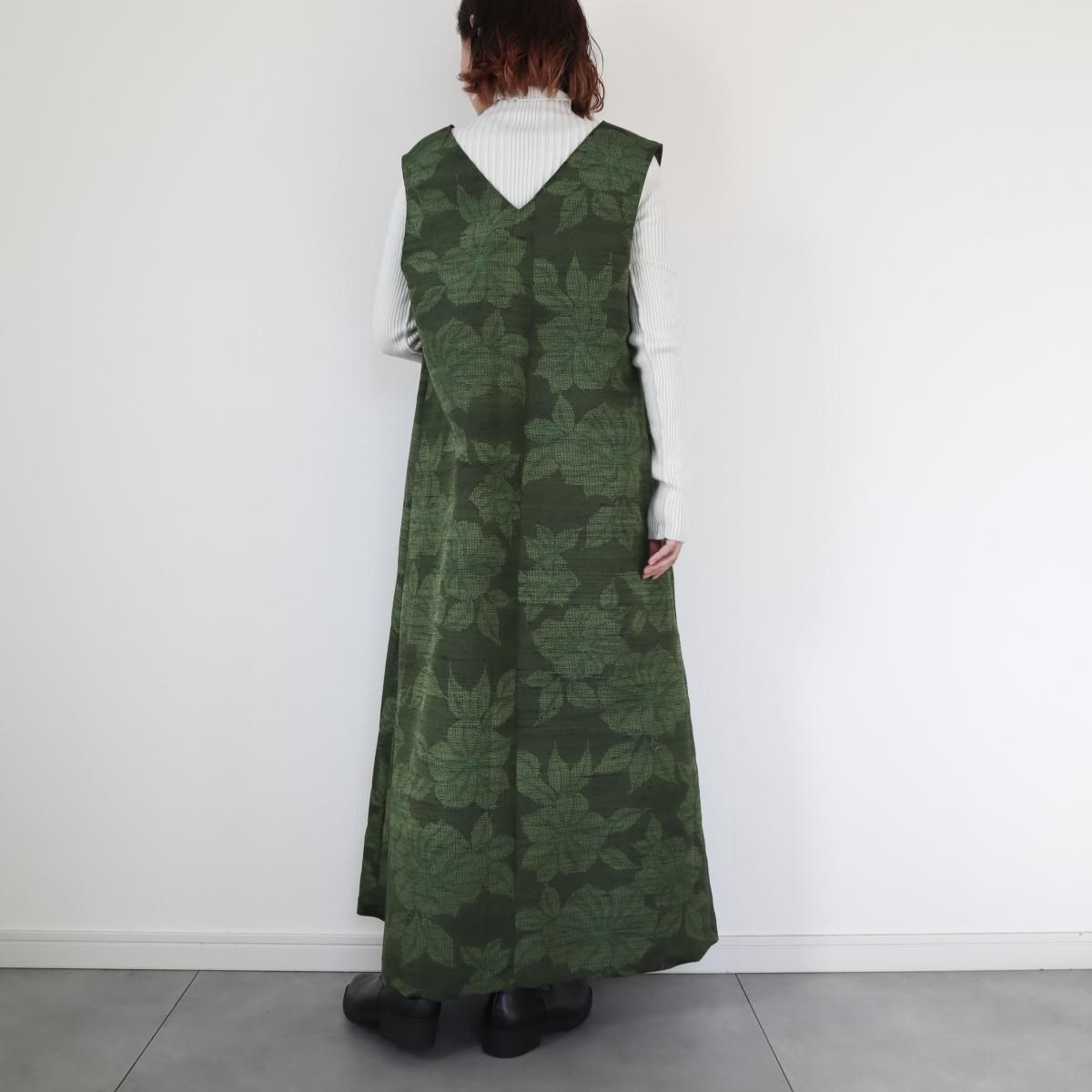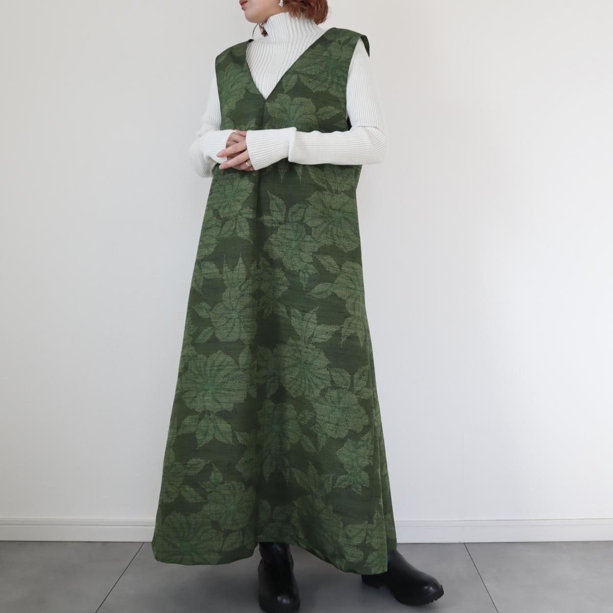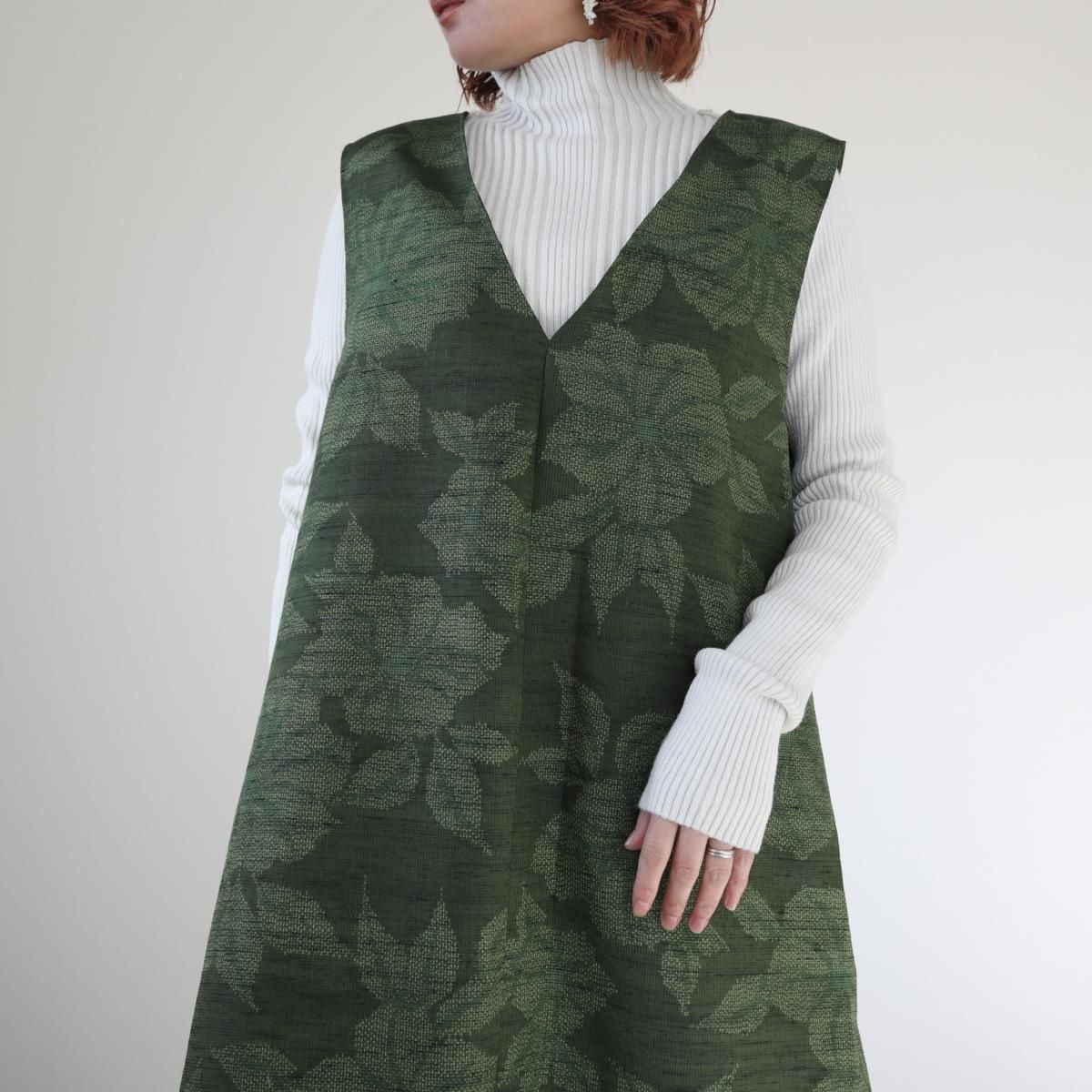 アンティーク着物から作ったジャンパースカートです。珍しい緑の地に花の柄。薄手ですがしっかりとした紬の生地です。前後Vネックで体のラインがすっきりと見えます。肩から胸位置にのみ裏地つき。