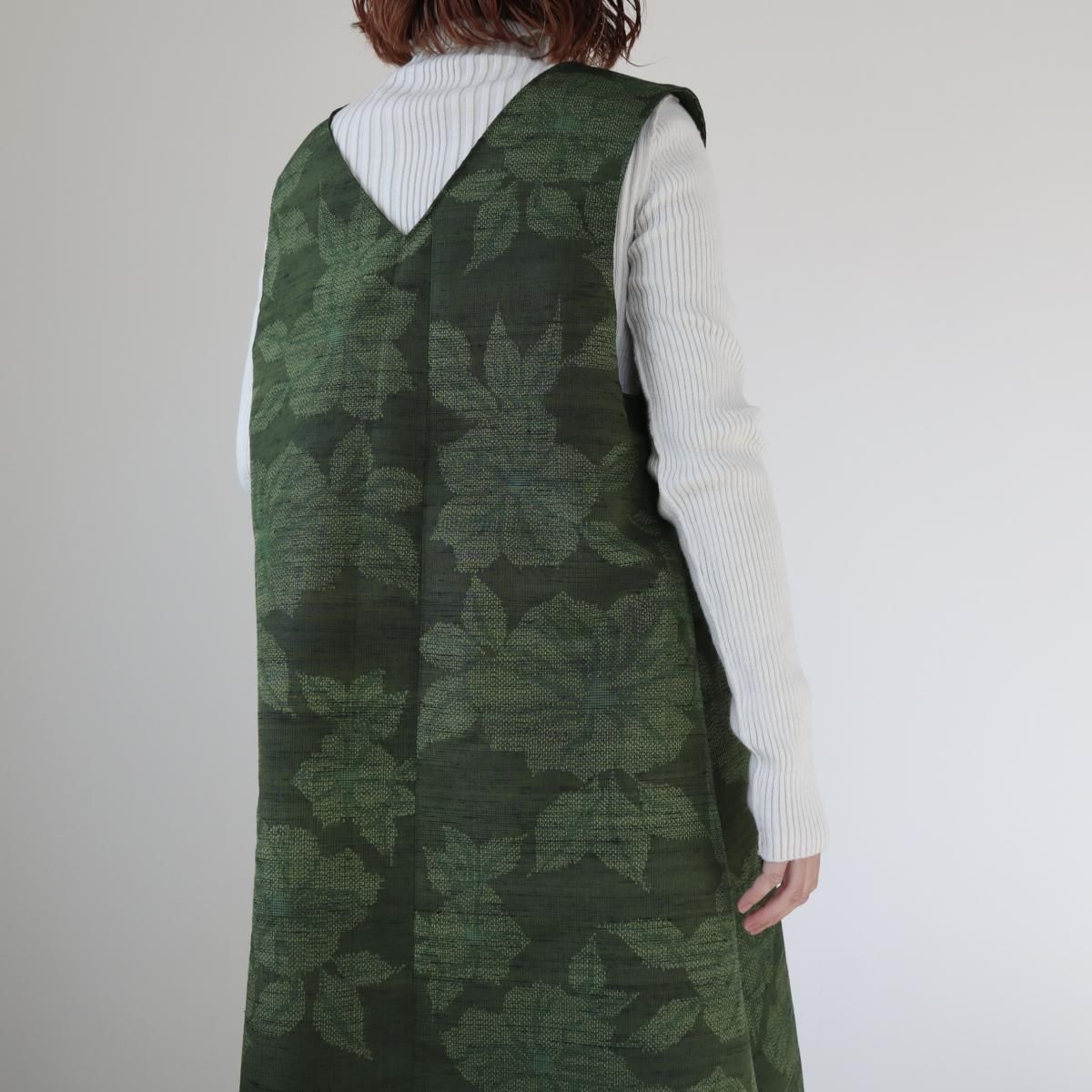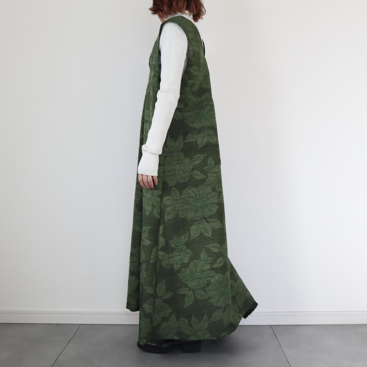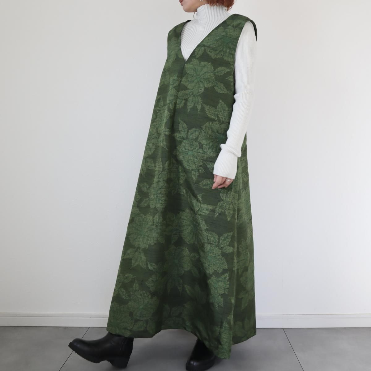 アンティーク着物から作ったジャンパースカートです。珍しい緑の地に花の柄。薄手ですがしっかりとした紬の生地です。前後Vネックで体のラインがすっきりと見えます。肩から胸位置にのみ裏地つき。