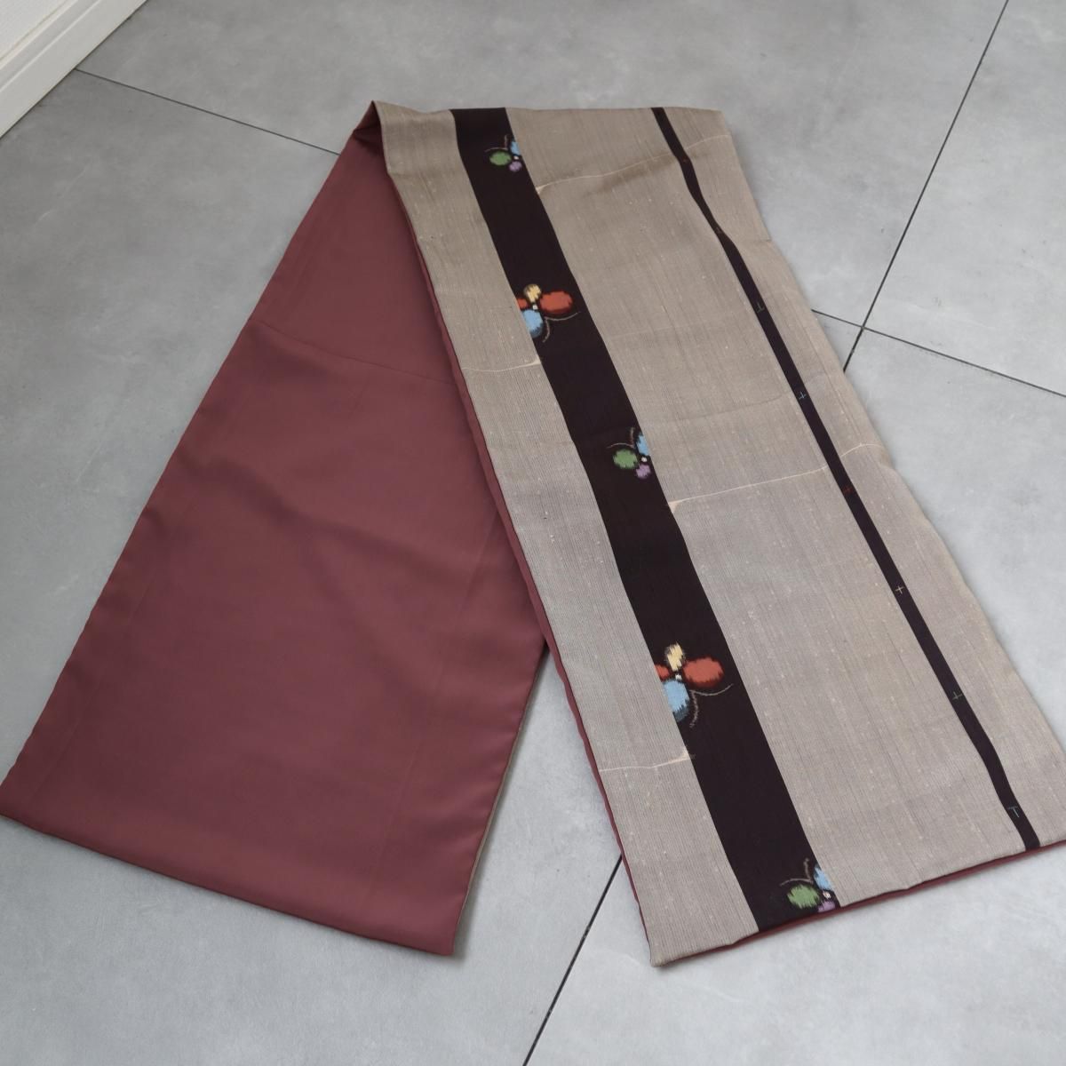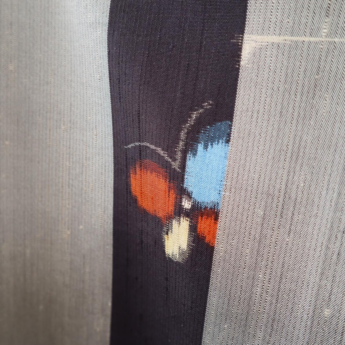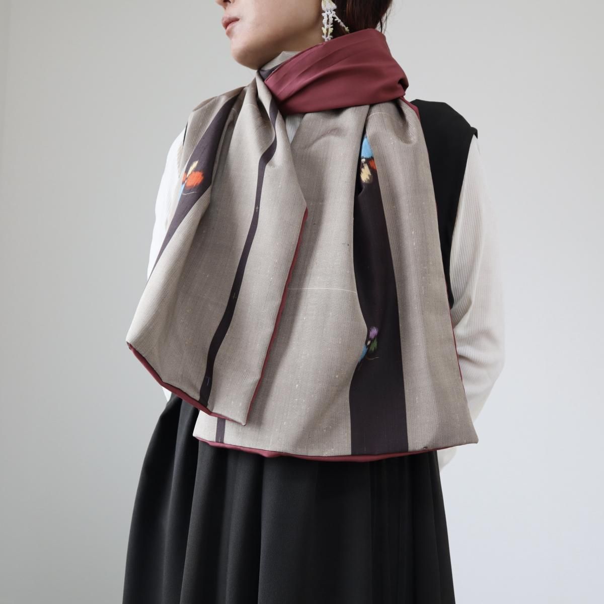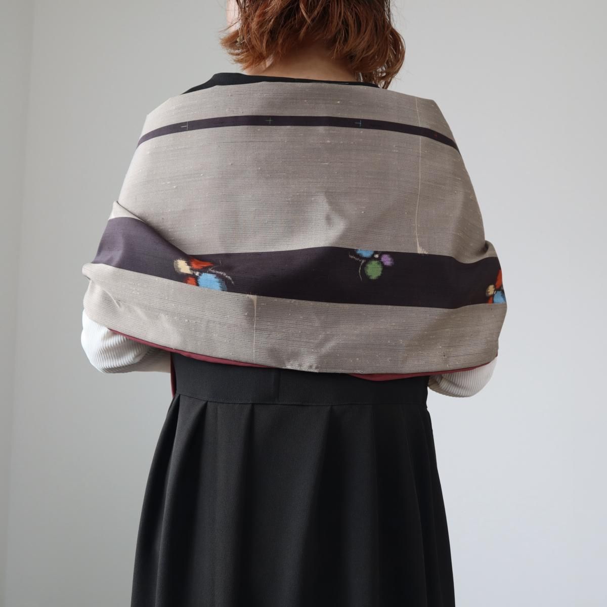 アンティーク着物から作ったショールです。グレージュカラーの地に黒の縦縞と蝶の柄。シャリ感のある、銘仙に似た生地です。裏地には鈍いローズピンク色の八掛けを使用しました。いずれも薄手の生地です。留め具等はありません。肩にかけたり首に巻いたりしてご使用ください。