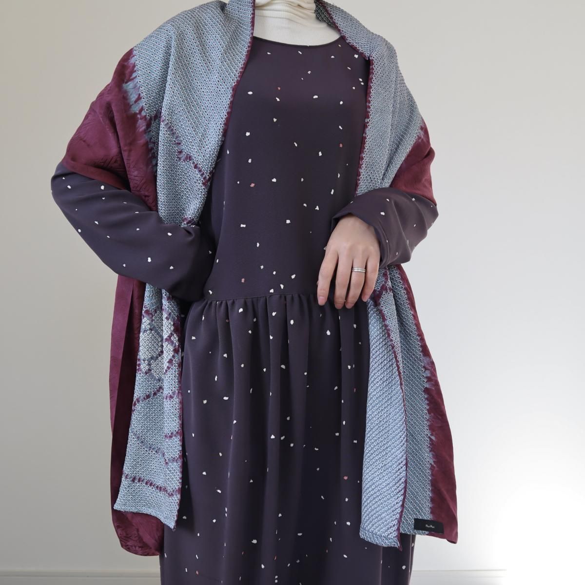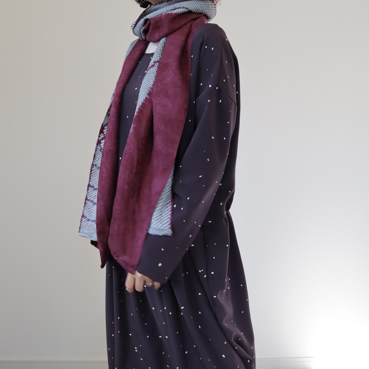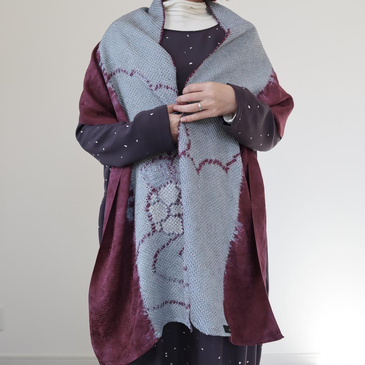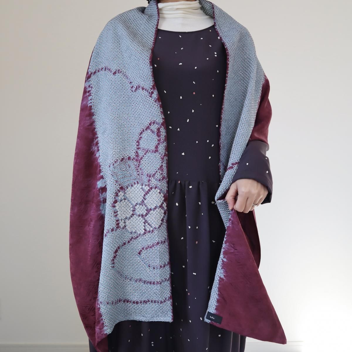 アンティークの絞りの羽織から作ったショールです。美しい水色×赤紫色。薄手で柔らかな生地で、無地部分は元々羽織の襟の内側に使われていた部分です。留め具等はありません。肩にかけたり首に巻いたりしてご使用ください。