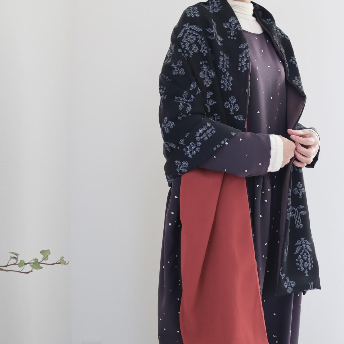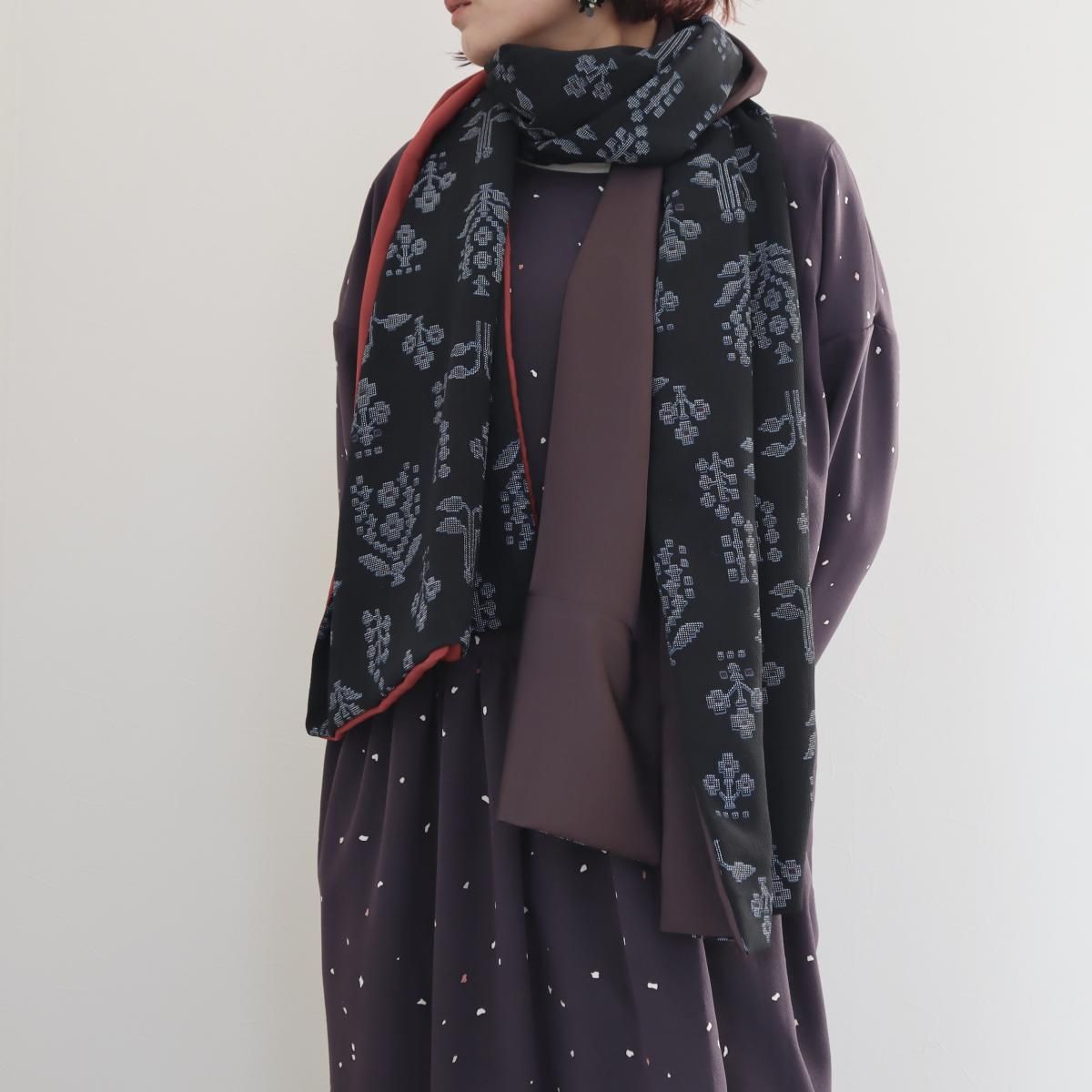 アンティーク着物から作ったショールです。薄手で柔らかな縮緬素材で黒地に花模様。裏地には2種類の八掛けを使用しました。留め具等はありません。肩にかけたり首に巻いたりしてご使用ください。