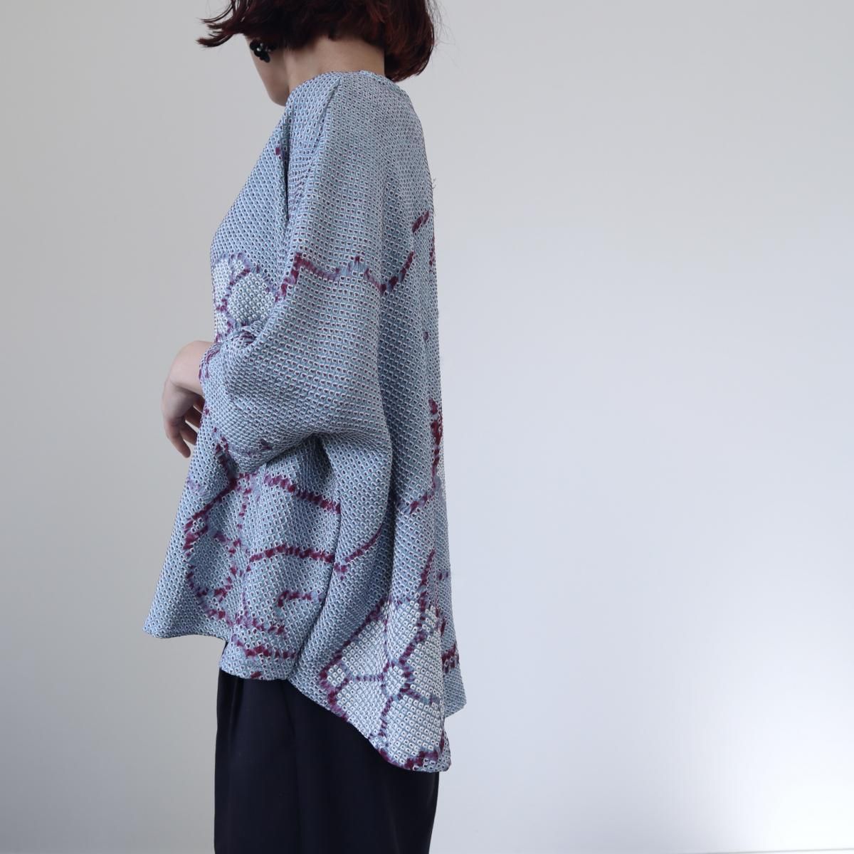 アンティークの絞りの羽織から作ったブラウスです。美しい水色×赤紫色に椿の花模様。とてもゆったりとした身幅のドルマン袖に太めのカフス。後ろ裾が長いデザインです。裏地はありません。中に薄手のセーター等重ねるのもおすすめです。
