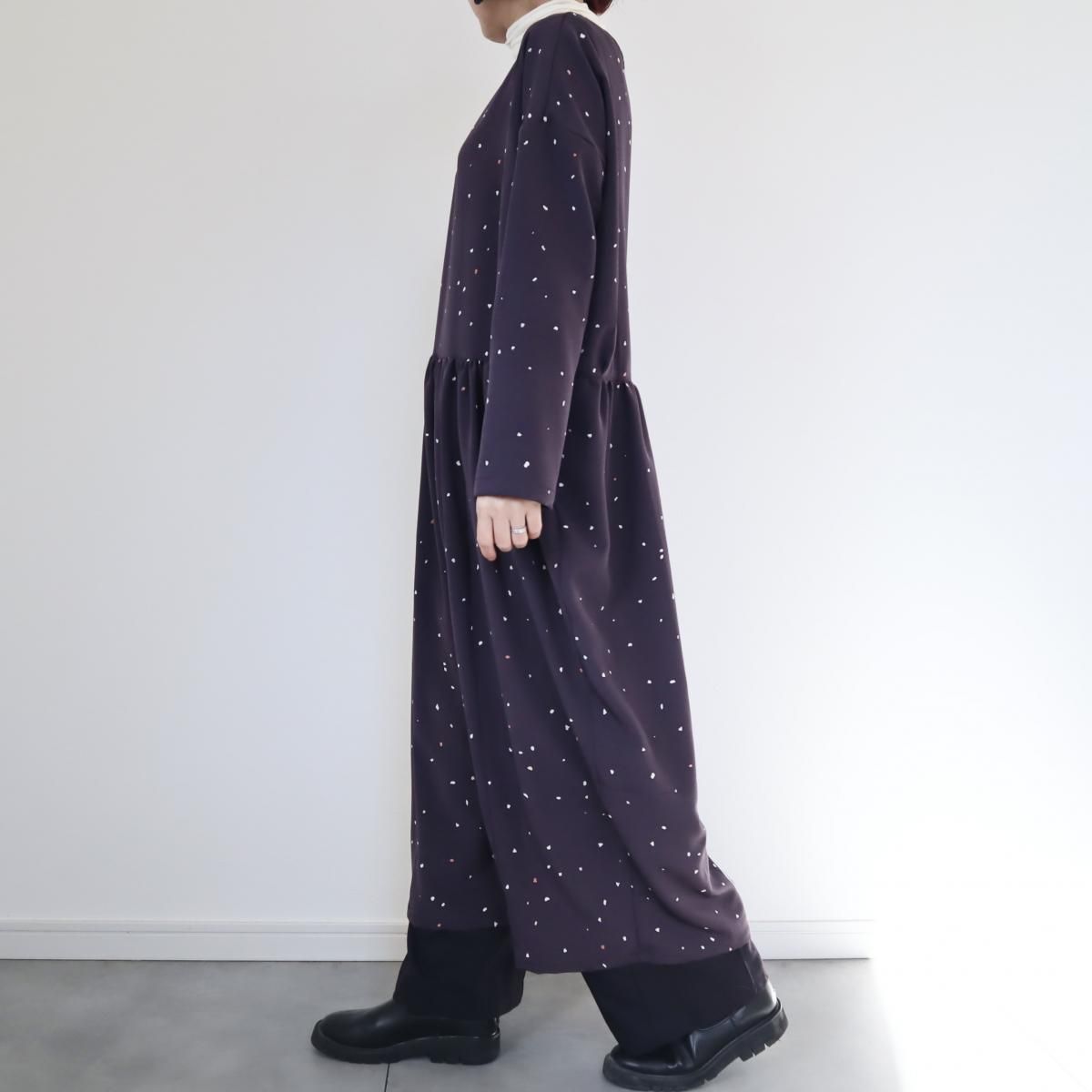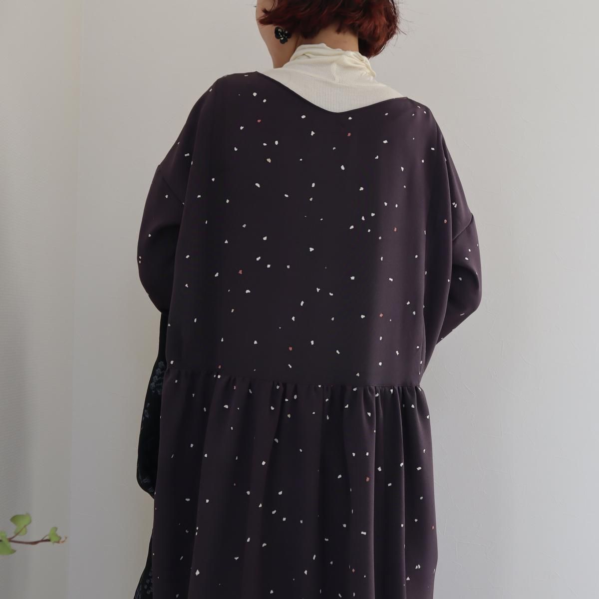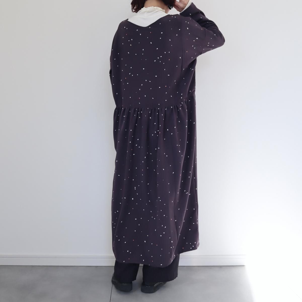アンティークの小紋の着物から作ったワンピースです。薄手で柔らかですがしっかりとした縮緬素材でやや紫がかった茶色の地に雪のような柄。ローウエストで生地を切り替えギャザーをたっぷり入れていますがコクーン(繭)シルエットの為裾の広がりは控えめです。裏地はありません。
