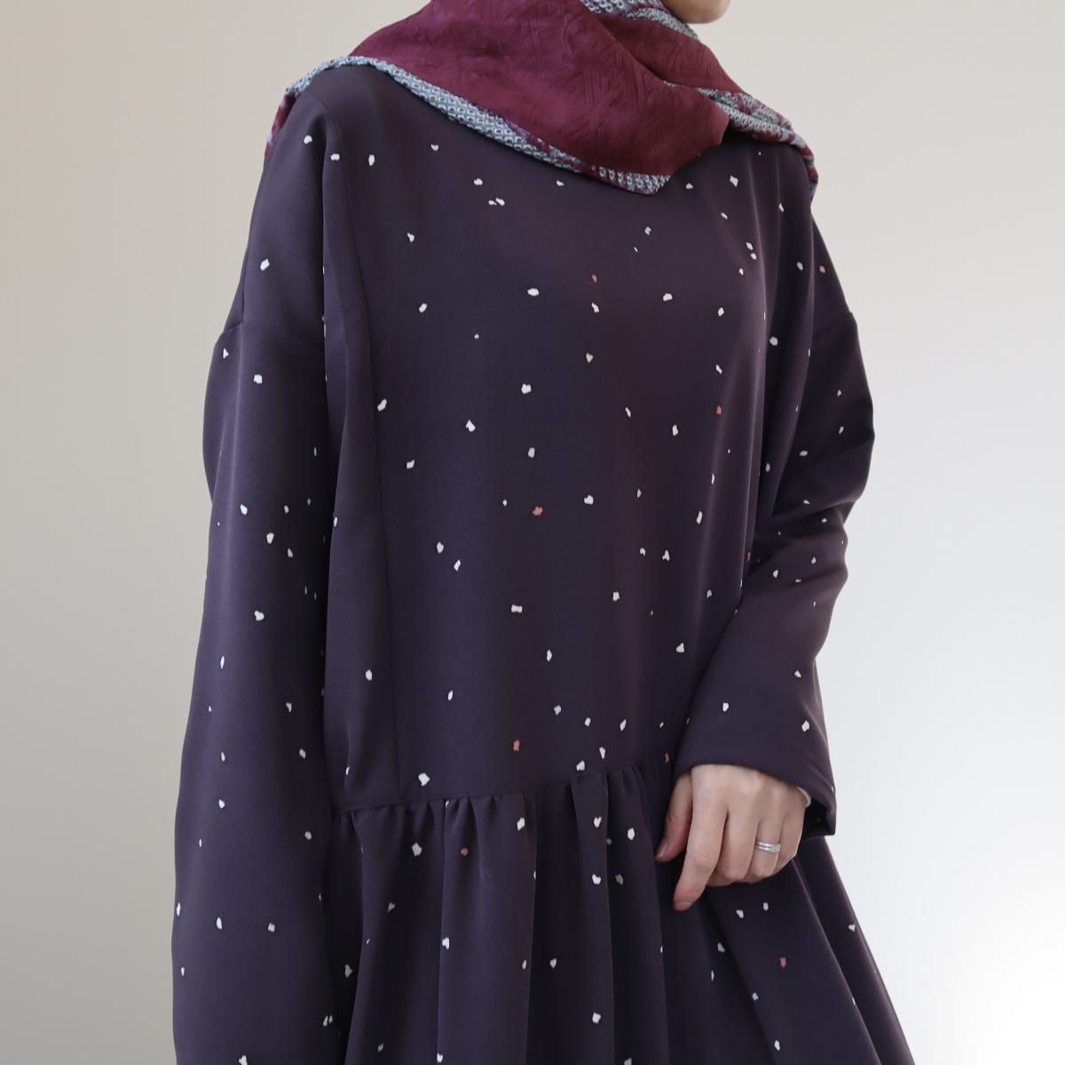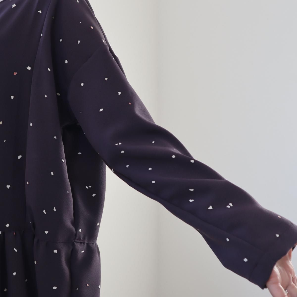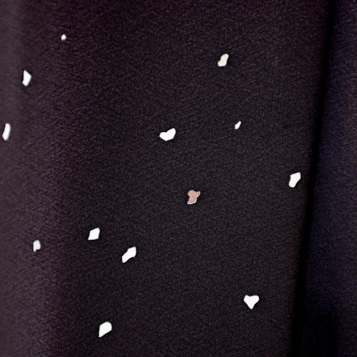 アンティークの小紋の着物から作ったワンピースです。薄手で柔らかですがしっかりとした縮緬素材でやや紫がかった茶色の地に雪のような柄。ローウエストで生地を切り替えギャザーをたっぷり入れていますがコクーン(繭)シルエットの為裾の広がりは控えめです。裏地はありません。