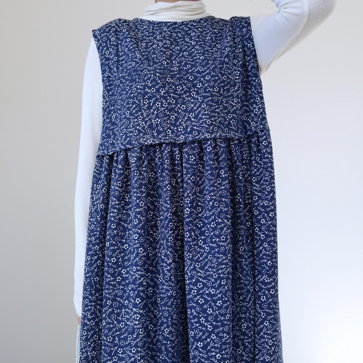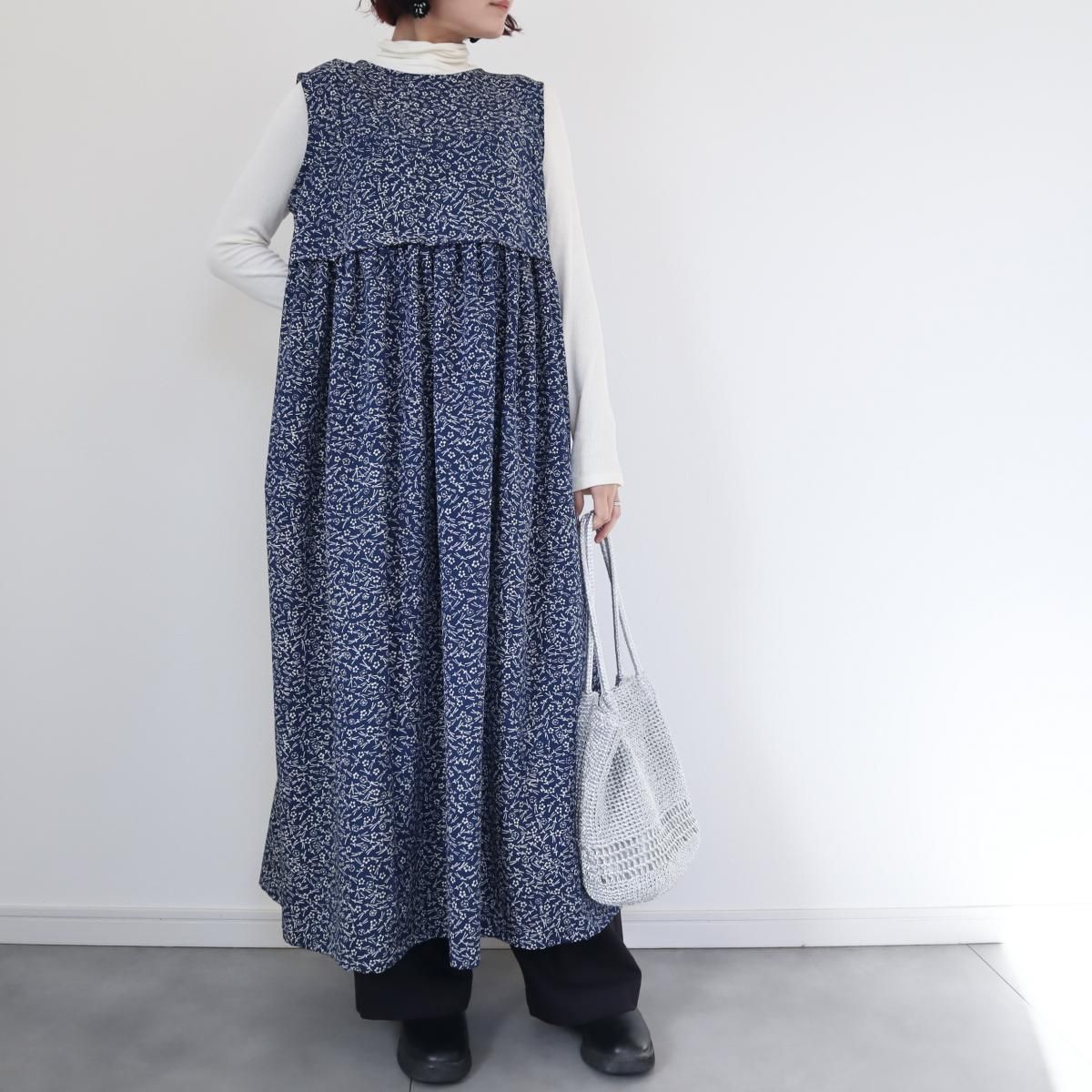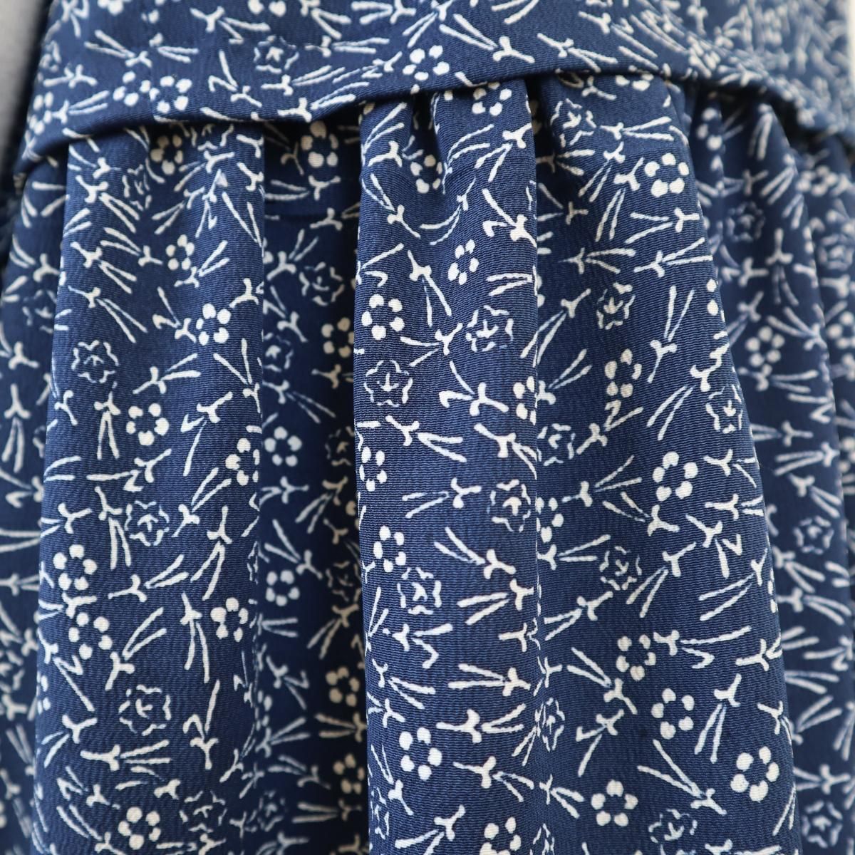 アンティークの小紋の着物から作ったワンピースです。薄手で柔らかですがしっかりとした縮緬素材。ハイウエストで生地を切り替えギャザーをたっぷり寄せましたが、裾の広がりは抑えたシルエットに仕上げています。裏地はありません。
